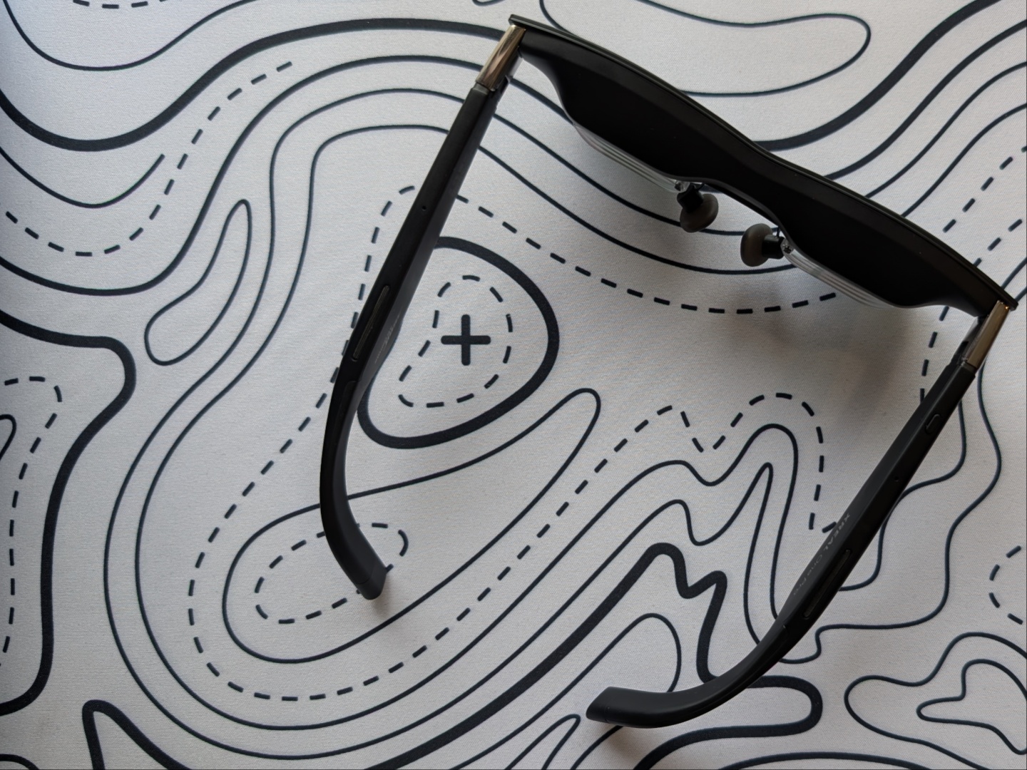 Kabel USB wychodzi zza ucha i jest wystarczająco długi, aby poprowadzić go do laptopa na biurku przed tobą lub telefonu umieszczonego w kieszeni. Nie zwiększa on wagi okularów ani nie przeszkadza, więc jest to plus.