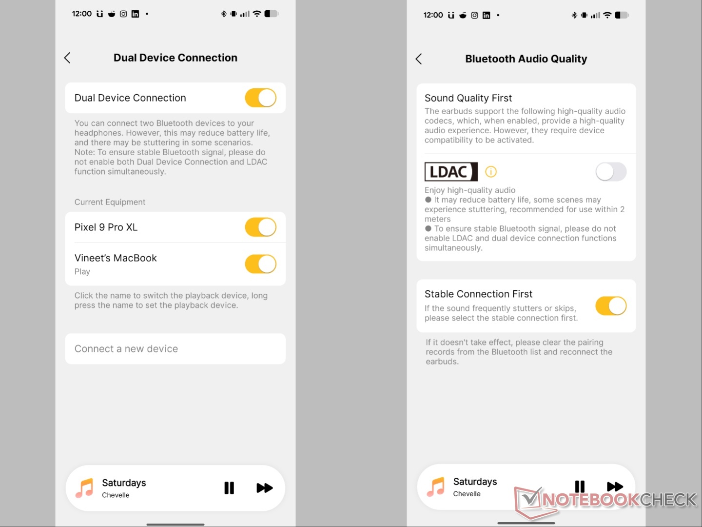 LDAC działa zgodnie z oczekiwaniami i zauważyliśmy nieco lepszą jakość dźwięku po sparowaniu z Pixel 9 Pro XL i włączeniu LDAC w opcjach programisty. Po włączeniu LDAC nie można korzystać z połączenia dwóch urządzeń. Mówiąc o tym, parowanie z dwoma urządzeniami - Pixel i MacBook Air M4 - działało zgodnie z reklamą, a słuchawki douszne automatycznie przełączały się na źródło z aktywnym dźwiękiem. Zauważyliśmy jednak, że po wyjęciu wkładek dousznych z etui i ich automatycznym połączeniu z oboma urządzeniami, odtwarzanie muzyki na telefonie nie wysyłało dźwięku do wkładek dousznych. Po odłączeniu od MacBooka Air słuchawki ponownie zaczęły wysyłać dźwięk z telefonu, co wskazuje, że fałszywie wykrywały wejście audio z MacBooka Air, mimo że nic nie było odtwarzane. Po odłączeniu i ponownym podłączeniu do MacBooka Air słuchawki działały tak, jak powinny. Problem jednak często powraca.