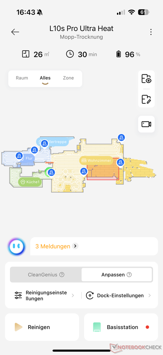 Aplikacja oferuje wiele opcji zarządzania robotem odkurzającym. Oprócz różnych ustawień wydajności czyszczenia (moc ssania, wilgotność, trasa i inne), zapewnia ona kompleksowy przegląd procesu czyszczenia i potencjalnych obszarów problemowych w zwykły sposób za pośrednictwem wirtualnej mapy. Oczywiście mapy (które można również zapisać dla kilku pięter) można edytować, np. w celu nadania nazw poszczególnym pomieszczeniom i utworzenia wirtualnych granic.