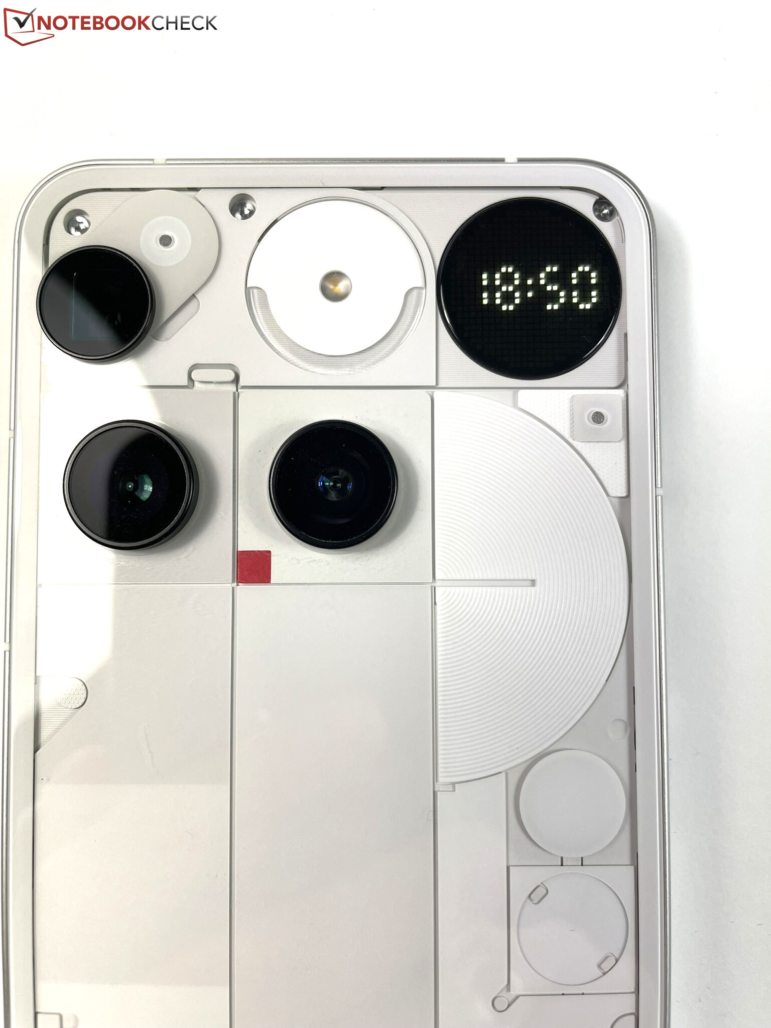 Matryca Glyph znajduje się w prawym górnym rogu i pokazuje na przykład poziom naładowania baterii lub dostarcza informacji o przychodzących wiadomościach. Wyświetlacze (aka Glyph Toys) można przełączać za pomocą białego przycisku pod spodem. Czerwona dioda LED sygnalizuje miganiem trwające nagrania audio i wideo.