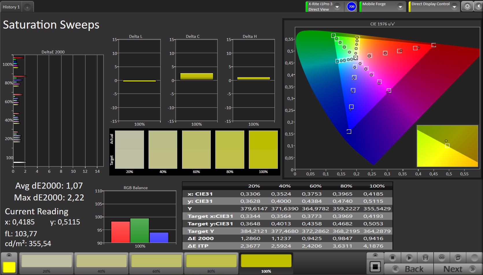 Maksymalna jasność w codziennych sytuacjach wynosi około 1100 cd/m², co jest typowe dla tej klasy. Na małych obszarach zmierzyliśmy około 1434 cd/m². Podczas oglądania treści HDR, w niektórych obszarach możliwe jest osiągnięcie nawet 1800 cd/m². To dobry wynik, ale nie rekordowy.