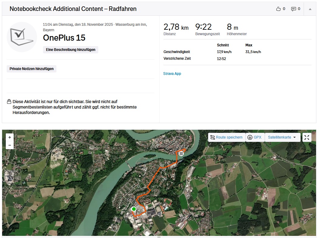 Oba urządzenia obliczyły dokładnie tę samą odległość, a OnePlus 15 dokładnie przedstawił naszą trasę. Na moście zostaliśmy umieszczeni kilka metrów poza naszą rzeczywistą ścieżką, ale ogólnie telefon bardzo dobrze nadaje się do nawigacji i śledzenia lokalizacji.