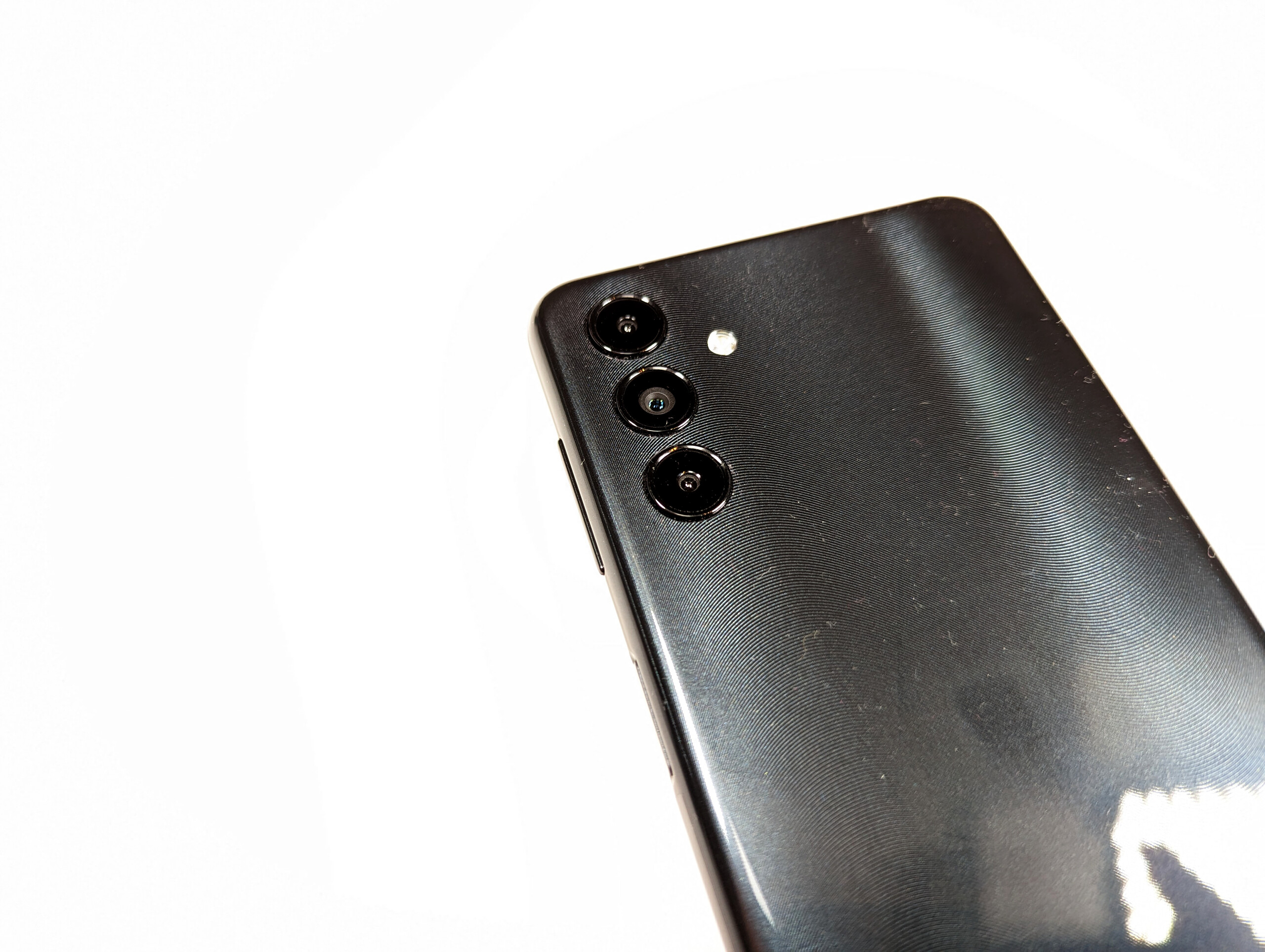 Model Galaxy A04s ma plecy z błyszczącego tworzywa sztucznego z lekkim wzorem, który załamuje światło. Trzy obiektywy aparatów fotograficznych znajdują się każdy w swojej własnej nieozdobionej ramce pod sobą.