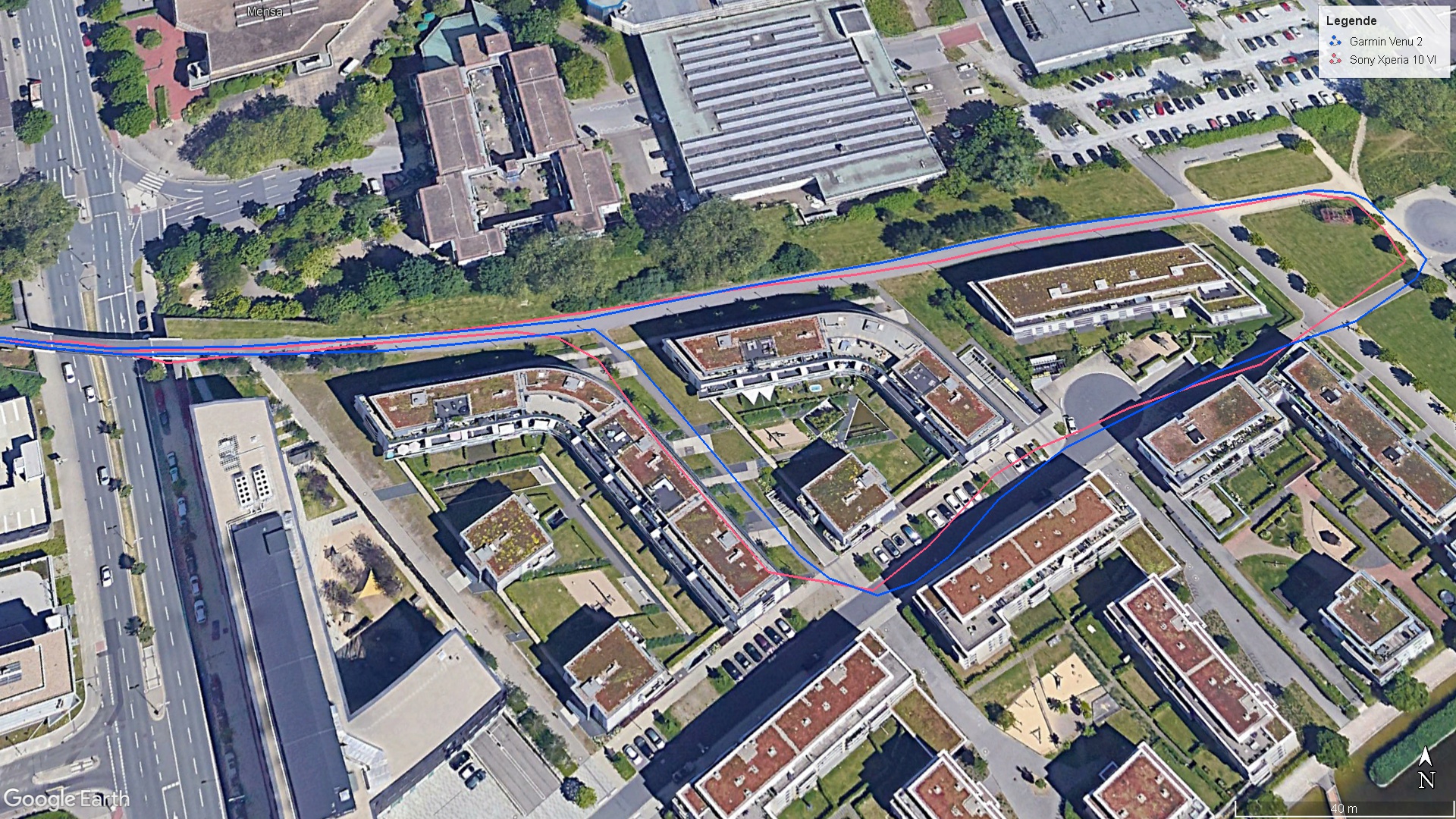 Telefon komórkowy Sony jest wyposażony w jednozakresowy GNSS. Aby ocenić dokładność pozycjonowania w praktyce, nagraliśmy trasę równolegle z Garmin Venu 2 dla porównania. Szczegółowa trasa wykazała jedną lub dwie niedokładności, co nie jest rzadkością w tym przedziale cenowym.