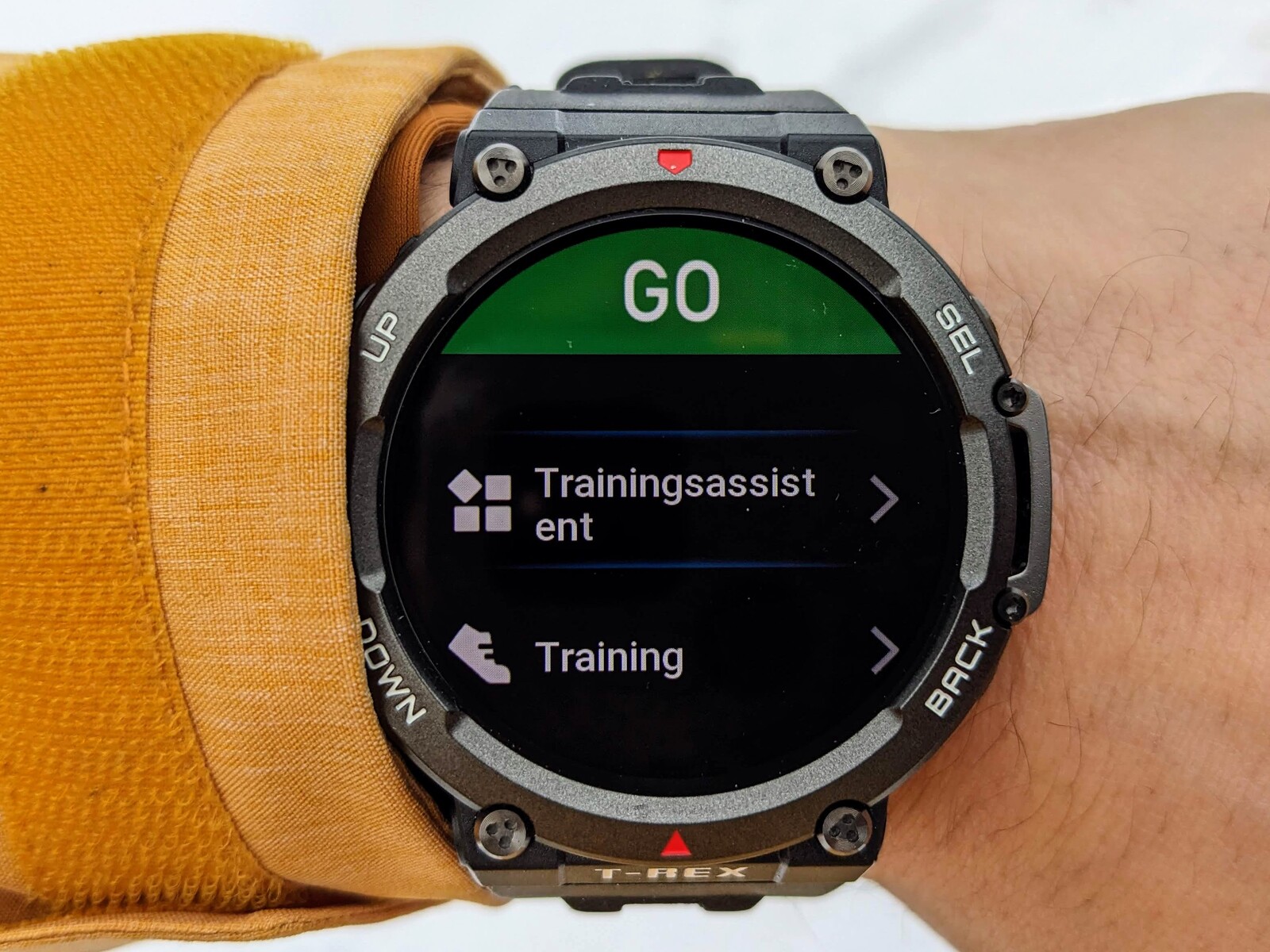 Sesje treningowe można łatwo zainicjować za pomocą przycisku szybkiego wyboru. T-Rex 2 oferuje wiele rodzajów sportów, które można śledzić. Sposób wyświetlania informacji na zegarku dostosowuje się do rodzaju treningu. Dodatkowo, w zależności od rodzaju sportu, można dostosować różne dane. Na przykład długość pasów podczas pływania w basenie. Podczas wędrówek można zintegrować importowane trasy, a podczas joggingu i jazdy na rowerze możliwy jest trening interwałowy. Zakres jest znacznie szerszy niż można tu dokładnie zilustrować.