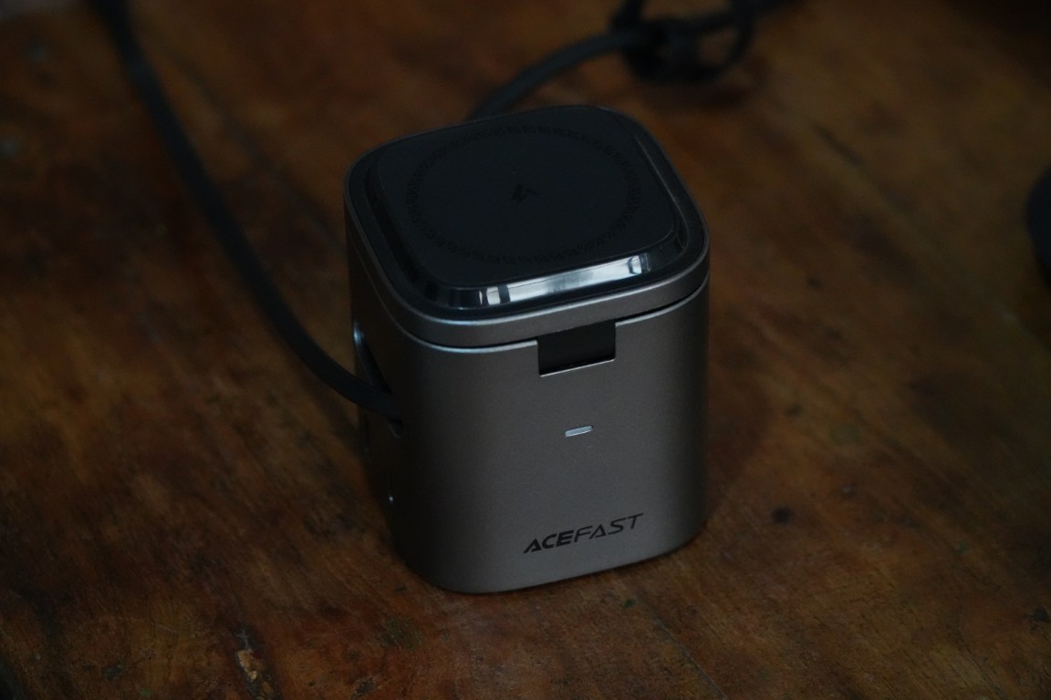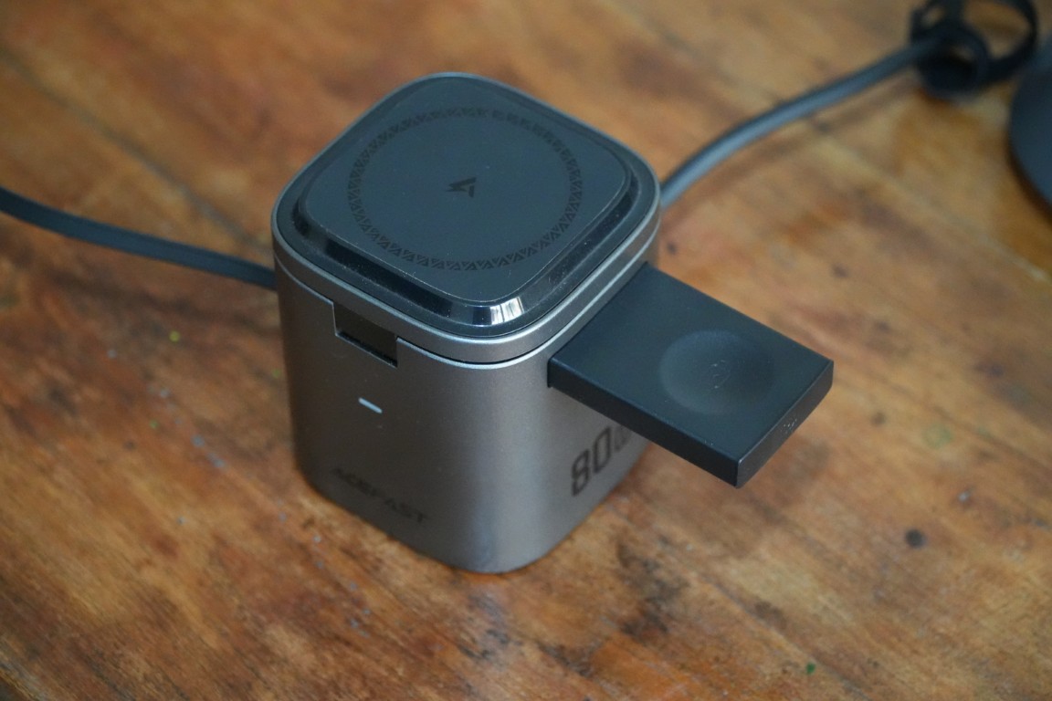 Stacja ładująca AceFast 6-w-1 80 W GaN ma bardzo wszechstronną konstrukcję. W przeciwieństwie do innych stacjonarnych stacji ładujących takich jak Anker i UgreenaceFast oferuje zarówno opcje ładowania przewodowego, jak i bezprzewodowego. Mówiąc dokładniej, dostępne są trzy podkładki do ładowania bezprzewodowego (w tym gniazda do ładowania zarówno Apple Watch, jak i AirPods) oraz trzy wyjścia przewodowe, z których dwa to porty USB (USB-A + USB-C), a jeden to zwijany kabel USB-C.
