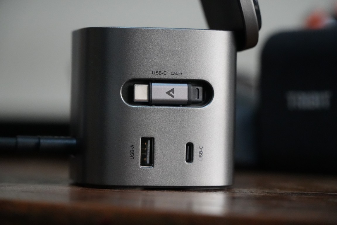 Po lewej stronie znajduje się zwijany kabel USB-C, który rozciąga się do 70 cm (2,29 stopy). Poniżej znajduje się jeden port USB-A i jeden port USB-C. Na spodzie znajdują się cztery silikonowe nóżki, które zapewniają stabilny i pewny chwyt na biurku. Co więcej, AceFast zintegrował również diodę LED z przodu, która świeci po włączeniu.