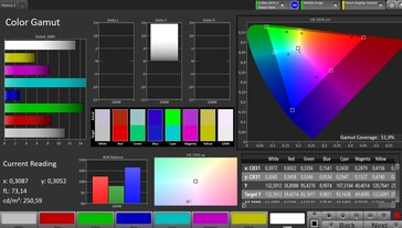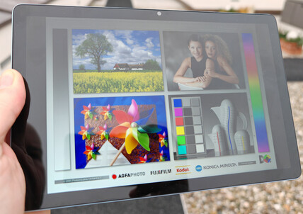 W naszych testach z oprogramowaniem CalMAN i fotometrem spektralnym zauważyliśmy mocne zabarwienie kolorów, a szczególnie jasne odcienie niebieskiego i zielonego są odtwarzane bardzo zniekształcone. Ponadto tablet oferuje jedynie ograniczone pokrycie przestrzeni barw.