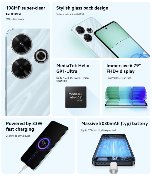 W szczególności Xiaomi zaprojektowało opcje kolorystyczne Midnight Black, Ocean Blue, Pearl Pink i Sandy Gold dla Redmi 13, wszystkie ze szklanymi panelami tylnymi i certyfikatem IP53 przed wnikaniem pyłu i wody. Co więcej, 8,3 mm słuchawka trafi na niektóre rynki z maksymalnie 8 GB pamięci RAM i 256 GB pamięci masowej. Niestety nie wiadomo jeszcze, na jakich rynkach dostępna będzie ta topowa konfiguracja pamięci.