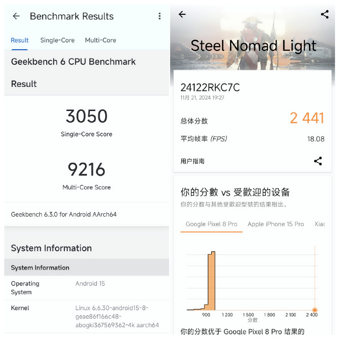 Pod względem graficznym Redmi K80 Pro wypada podobnie dobrze, uzyskując wynik 2441 w 3DMark Steel Nomad Light. Rzeczywista wydajność w grach jest również solidna, a telefon zapewnia najwyższą liczbę klatek na sekundę w grach takich jak Genshin Impact, Honkai: Star Trail i Honor of Kings, jednocześnie zazwyczaj utrzymując pobór mocy poniżej 4 W i unikając znacznych spadków liczby klatek na sekundę podczas testu.