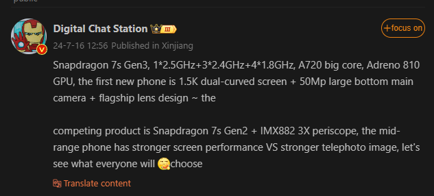 Jak można się spodziewać, Redmi Note 13 Pro będzie wyposażony w Qualcomm Snapdragon 7s Gen 3, podobnie jak jego poprzednikktóry zadebiutował z procesorem Snapdragon 7s Gen 2. Ulepszony SoC powinien dać mu przewagę nad Realme 13 Pro+ jednak telefon Realme ma być wyposażony w teleobiektyw, podczas gdy Redmi Note 14 Pro nie.