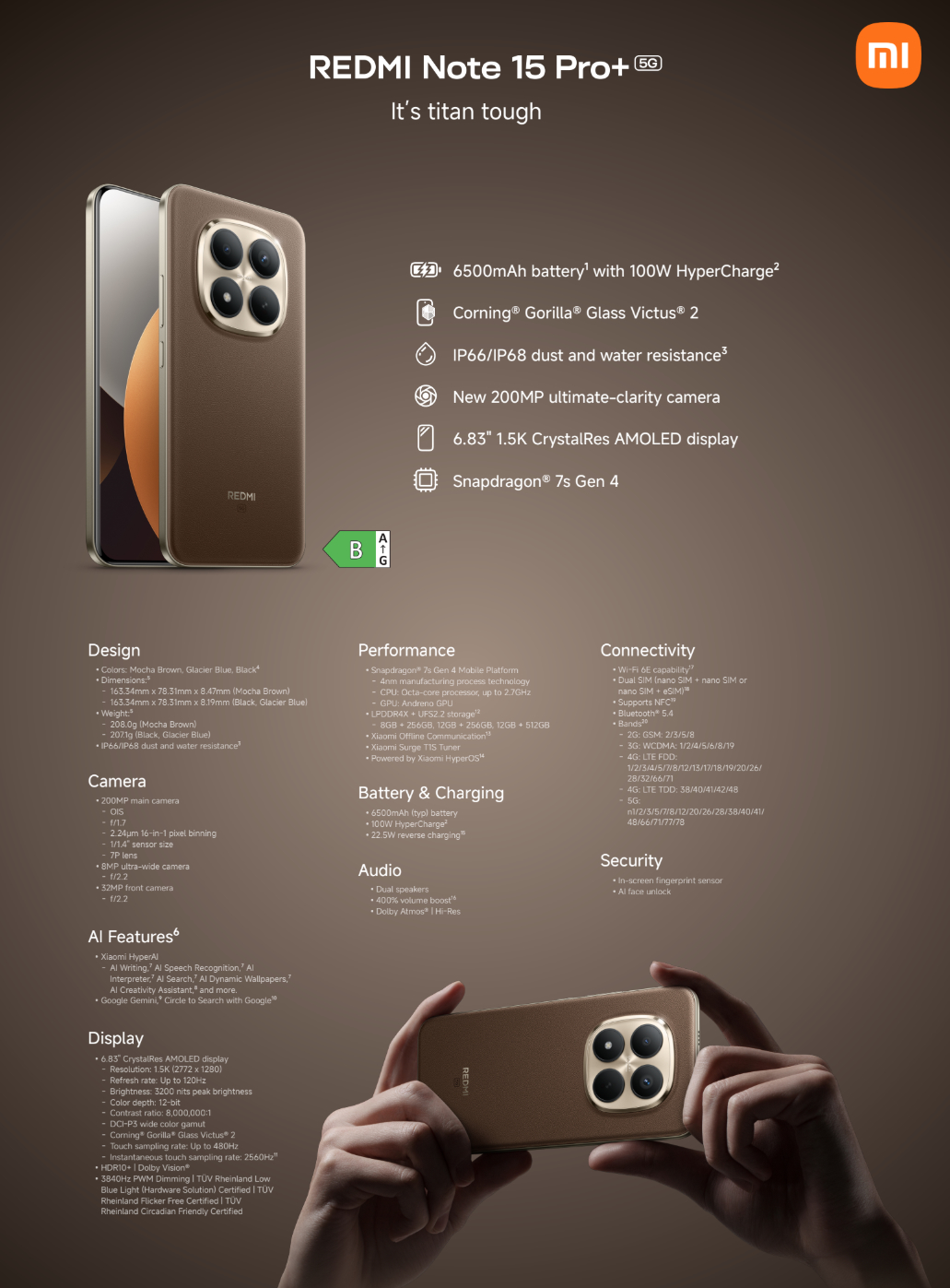 Ponadto, Xiaomi wyposażyło Redmi Note 15 Pro Plus w znacznie większą baterię niż jego poprzednik. Łącznie 6,500 mAh zamiast 5,110 mAh, bateria leży również u podstaw większego wyświetlacza, który wyświetla 2,722 x 1,280 pikseli z odświeżaniem 120 Hz i szczytową jasnością 3,200 nitów przy przekątnej 6,83 cala.