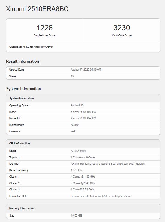 Zgodnie z informacjami udostępnionymi w Internecie przez wiele źródeł, Redmi Note 15 Pro Plus zadebiutował w Geekbench przed zbliżającą się premierą w Chinach. Telefon średniej klasy był wcześniej napiwek być zasilany przez Snapdragon 7s Gen 3 i jest wymieniony z chipsetem na pokładzie - choć w stanie podkręconym. Wersja Snapdragona 7s Gen 3 testowana na Redmi Note 15 Pro Plus ma swój główny rdzeń działający z częstotliwością 2,71 GHz, co stanowi niezły skok częstotliwości z 2,50 GHz na Redmi Note 14 Pro Plus(kup na Amazon) i innych urządzeniach z tym chipsetem w zeszłym roku.