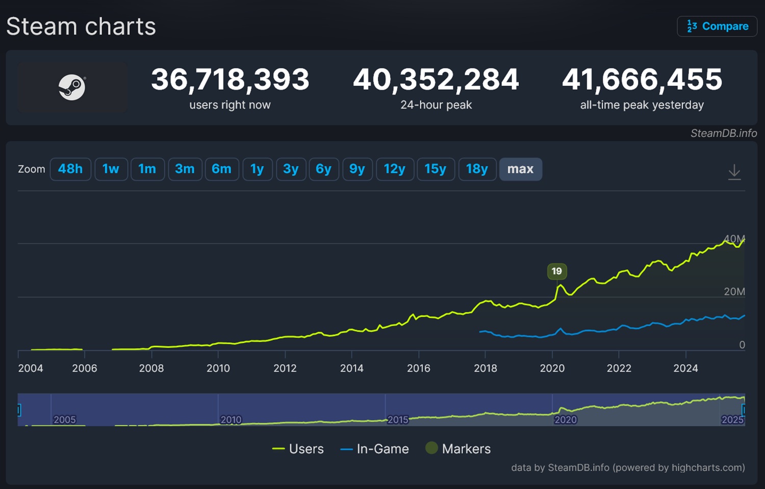 Steam pojawił się w 2003 roku jako sposób na wygodniejsze pobieranie, granie i aktualizowanie własnych tytułów Valve. Przyjęcie projektów innych firm kilka lat później przygotowało grunt pod przyszłą ekspansję. Według SteamDB, w 2008 roku Steam osiągnął liczbę 1 miliona graczy. Pandemia Pandemia COVID sprawiła, że w 2020 roku Steam przekroczył 24 miliony graczy, a do 2025 roku przekroczył próg 40 milionów.