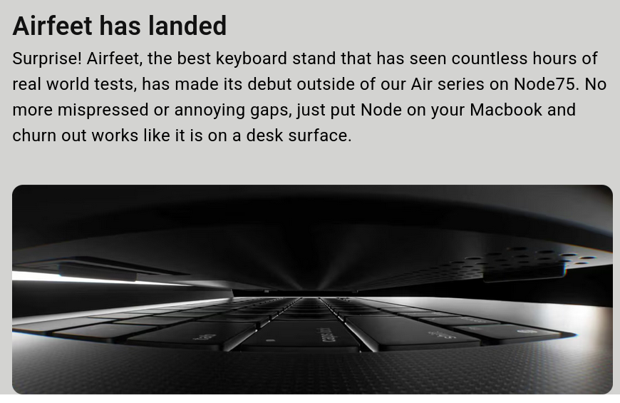 NuPhy Node75 będzie również wyposażony w te same nóżki, które umożliwiają umieszczenie klawiatur takich jak seria Air na górze standardowej klawiatury Apple MacBooka bez uruchamiania wbudowanych klawiszy klawiatury laptopa.