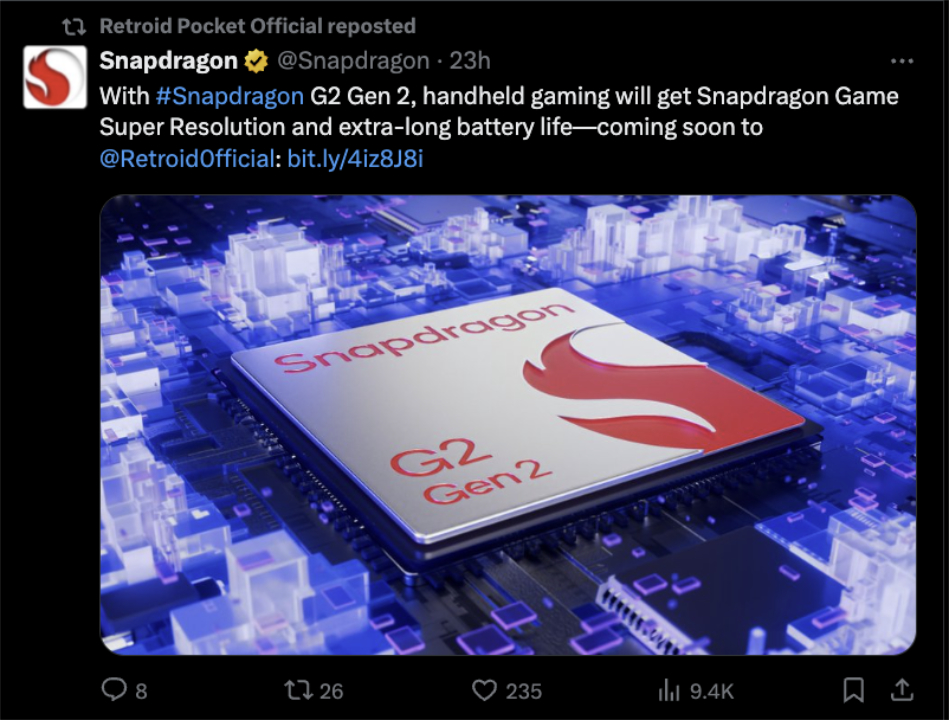 Na razie Retroid sugeruje jedynie, że zaprezentuje coś futurystycznego jeszcze w tym miesiącu. Konkretnie, firma potwierdziła, że ogłosi więcej szczegółów 27 października. W międzyczasie Qualcomm mógł już zasugerować że następny handheld do gier Retroid będzie korzystał ze Snapdragona G2 Gen 2, chipsetu, który zadebiutował w marcu wraz z dwoma innymi chipsetami przeznaczonymi do gier.