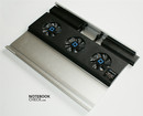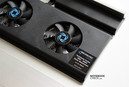 Trzeba zadać sobie pytanie, dlaczego są one mało skuteczne? To przewidywaliśmy od początku – skoro aluminiowa płyta jest lita, nie ma drogi odprowadzenia ciepłego powietrza, a co z tego, że wiatraczki podmuchają trochę chłodnym (trzeba powiedzieć, że ciąg nie jest zbyt intensywny – trudno go wyczuć, przystawiając dłoń, a kartkę papieru A4 powiew nie zdmuchuje a zsuwa z podstawki, podnosząc ja może na wysokość paru milimetrów). Lepsze (efektywniejsze) jest więc rozwiązanie Zalmana z płytą perforowaną, która zapewnia pewną cyrkulację powietrza.