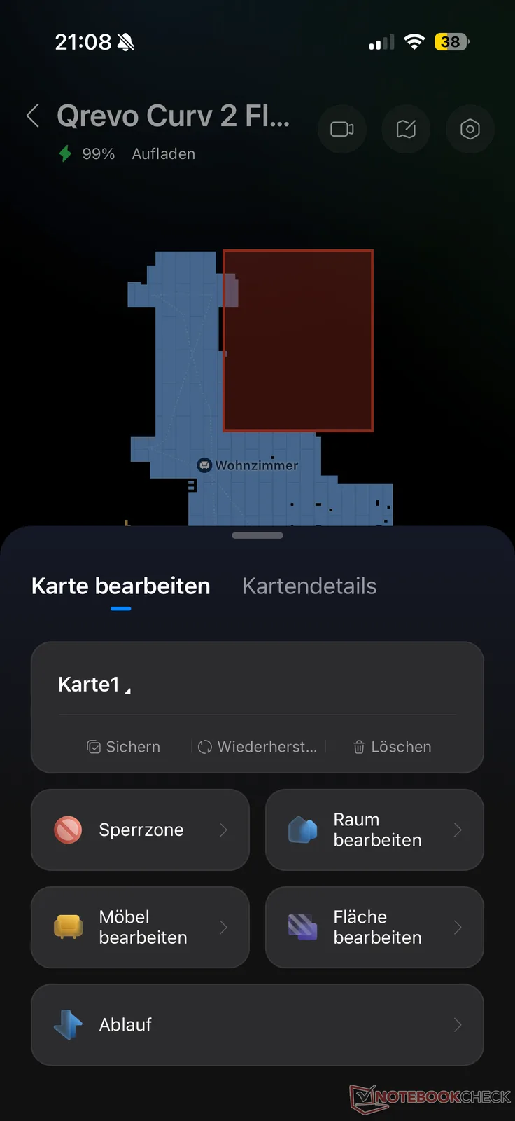 Qrevo Curv 2 Flow niezawodnie zeskanował otoczenie i stworzył wirtualną mapę w ciągu kilku minut. To już było całkiem dobre pod względem rozkładu przestrzennego. Po niewielkiej przeróbce, w tym opcjonalnych strefach wykluczenia, konfiguracja została zakończona w ciągu około 10 do 15 minut.
