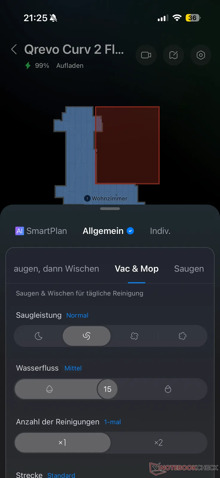 Jak zwykle, dostępnych jest wiele opcji ustawień czyszczenia, które znamy już z Qrevo Curv 2 Pro Qrevo Curv 2 Pro i innych modeli Roborock. Brakowało nam jednak trybu tylko do wycierania. Nie jest on oferowany, co naszym zdaniem miałoby sens w przypadku odkurzacza robota, który koncentruje się na wydajności mopowania. Zamiast tego, oprócz indywidualnej regulacji i "AI SmartPlan" z automatyczną regulacją AI, Qrevo może opcjonalnie "Odkurzać, a następnie mopować", "Odkurzać i mopować" oraz "Odkurzać". Moc ssania można regulować w czterech stopniach, a wilgotność mopa w 30 stopniach.
