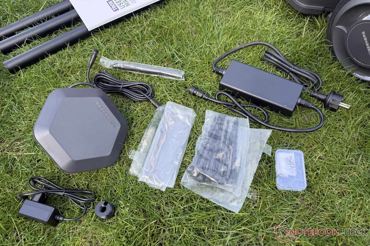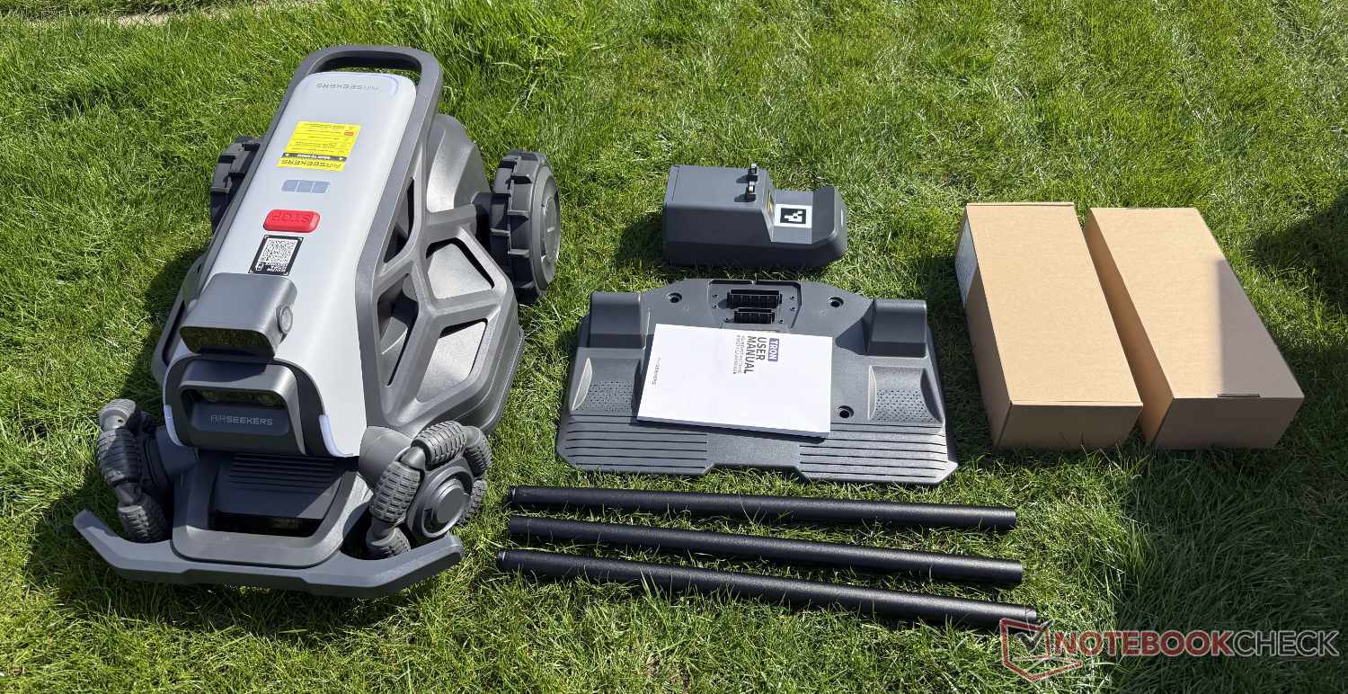 Zakres dostawy obejmuje wiele części. Oprócz zrobotyzowanej kosiarki, w pudełku o wymiarach 80 x 50 x 45 cm i wadze 32 kg znajduje się stacja bazowa RTK z trzyczęściową rurą i kolcem uziemiającym, stacja ładująca (którą należy jeszcze skręcić), dwie ładowarki, sześć zapasowych ostrzy, narzędzia i płyta ochronna.