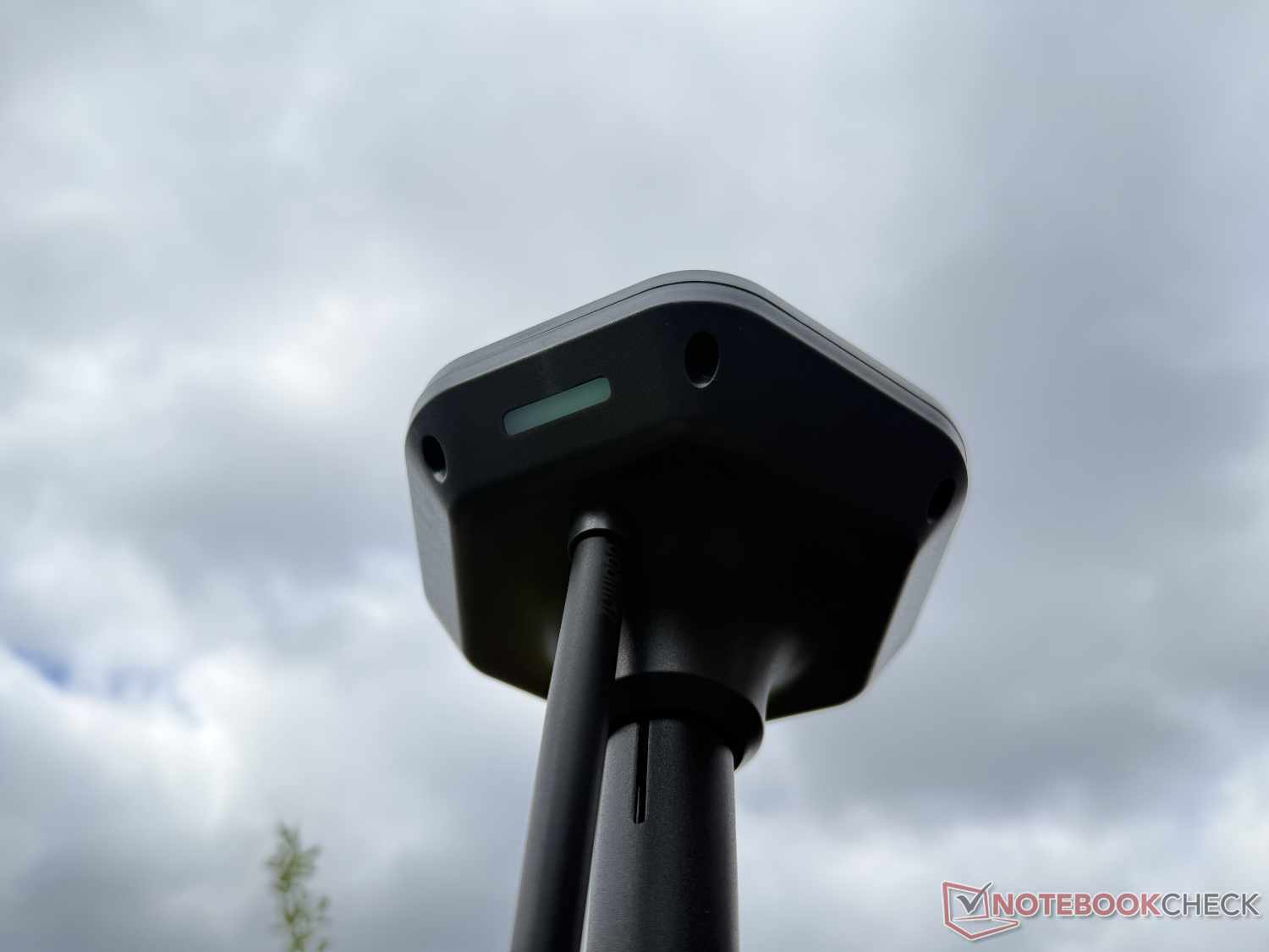 Stacja ładująca jest następnie mocowana do podłoża za pomocą śrub uziemiających i (w razie potrzeby) antena RTK jest ustawiana i podłączana do stacji ładującej wraz z kablem zasilającym z tyłu za małą klapką. Niestety kabel RTK jest bardzo krótki. Dlatego stacja musi być umieszczona blisko stacji ładującej. Alternatywnie, do naszego urządzenia testowego dołączono dodatkowy zasilacz, za pomocą którego stację można również ustawić daleko, ale wtedy wymaga ona również własnego gniazdka elektrycznego.