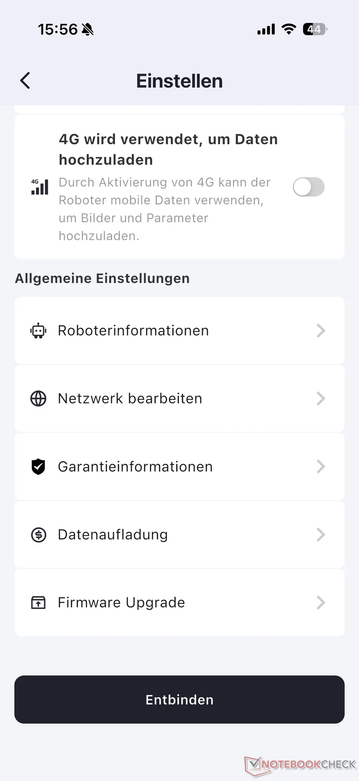W prawym górnym rogu znajduje się klasyczne koło zębate do otwierania ustawień. Otwiera to menu, które zawiera podstawowy wybór opcji związanych z RTK/nRTK, trybem nocnym, sekwencją koszenia, aktywacją 4G i ładowaniem danych, a także aktualizacjami oprogramowania układowego, oprócz przeglądu przebiegu. Nie ma opcji regulacji czułości wykrywania przeszkód.
