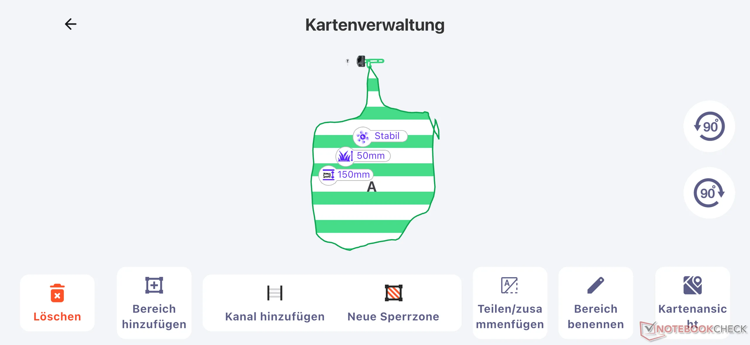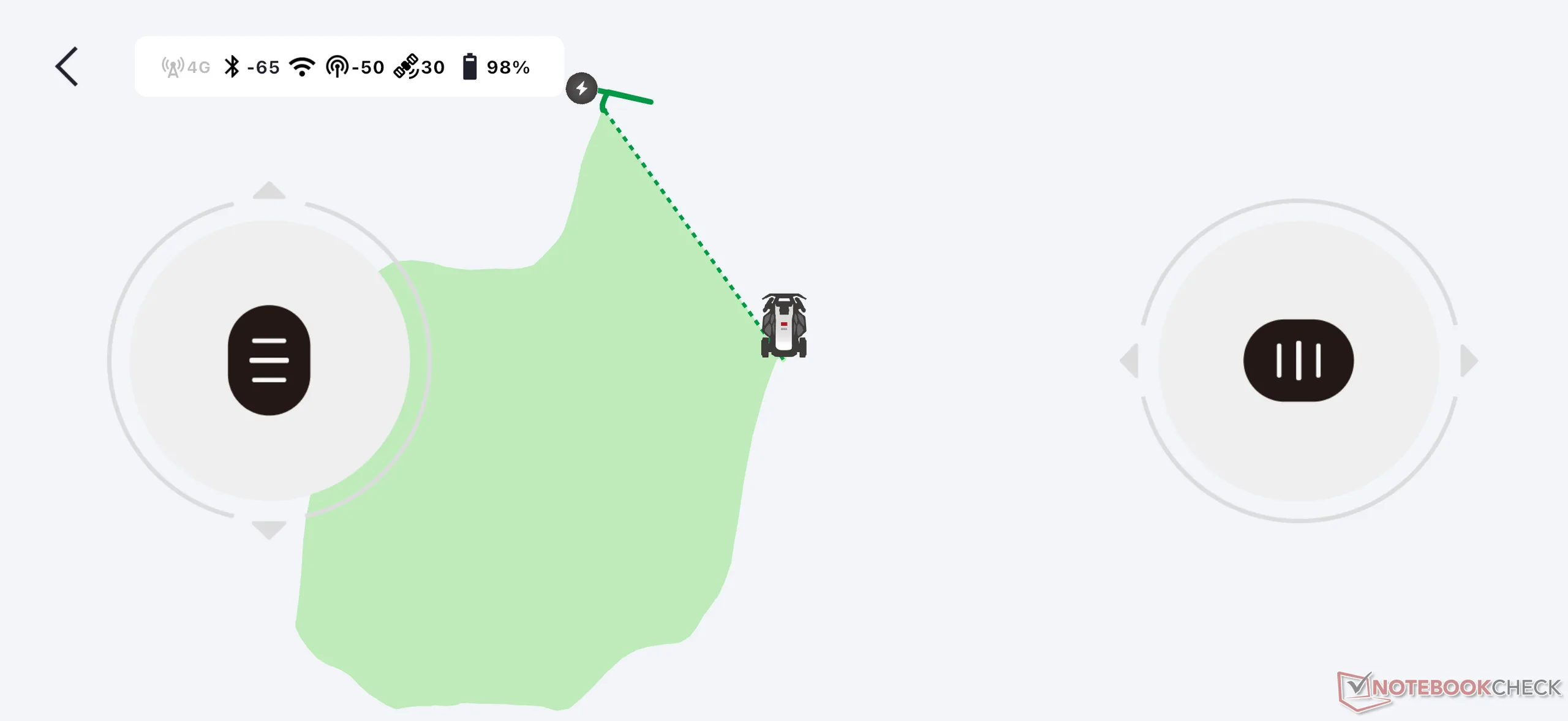 Po tym następuje obowiązkowa runda mapowania. Polega ona na jednokrotnym manewrowaniu robotem-kosiarką wzdłuż krawędzi trawnika za pomocą dwóch wirtualnych joysticków na wyświetlaczu. Niestety, robot reaguje bardzo wrażliwie na polecenia wprowadzane na ekranie dotykowym smartfona. Może to szybko prowadzić do nadmiernych reakcji, takich jak zbyt szybka jazda lub zbyt ostry skręt, co szkodzi dokładności mapy.