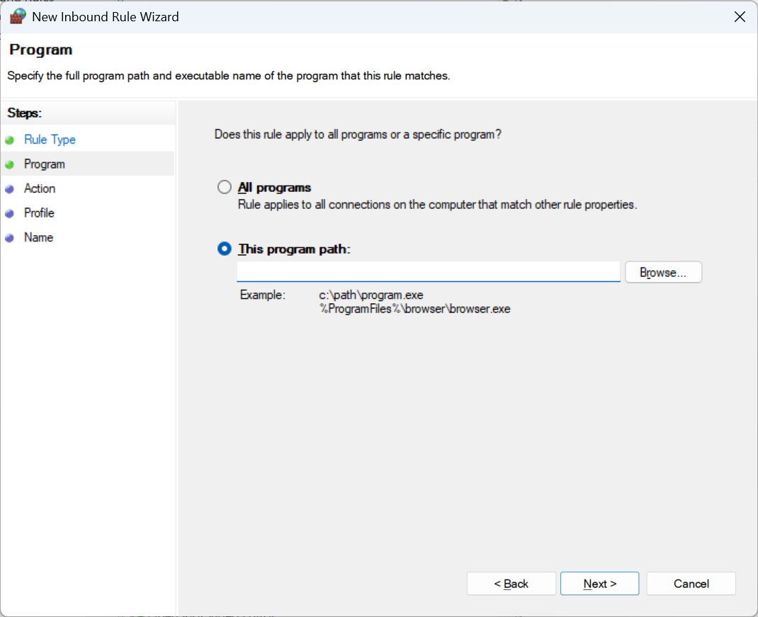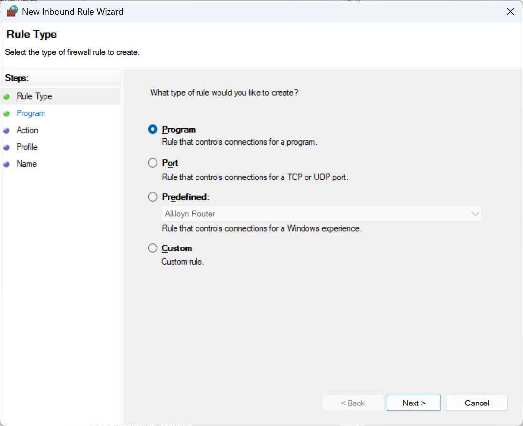 - Proszę kliknąć Reguły przychodzące → Nowa reguła → Program