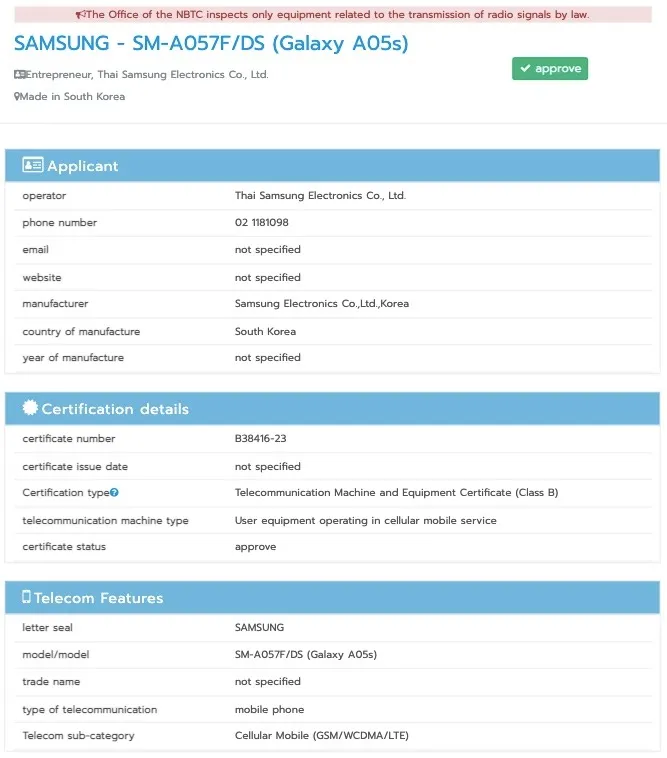 Urządzenie zostało uznane jako SM-A057F lub SM-A057F/DS przez FCC, chociaż NBTC potwierdza, że jest to rzeczywiście Galaxy A05s, podczas gdy SM-A055F/DS to A05dlatego wydaje się, że smartfony Samsunga bez 5G są przeznaczone do szczególnie rozczarowujących specyfikacji z być może tylko 1 podstawową zaletą, aby utrzymać je na poziomie przyjazny dla budżetu poziomie w najbliższej przyszłości.