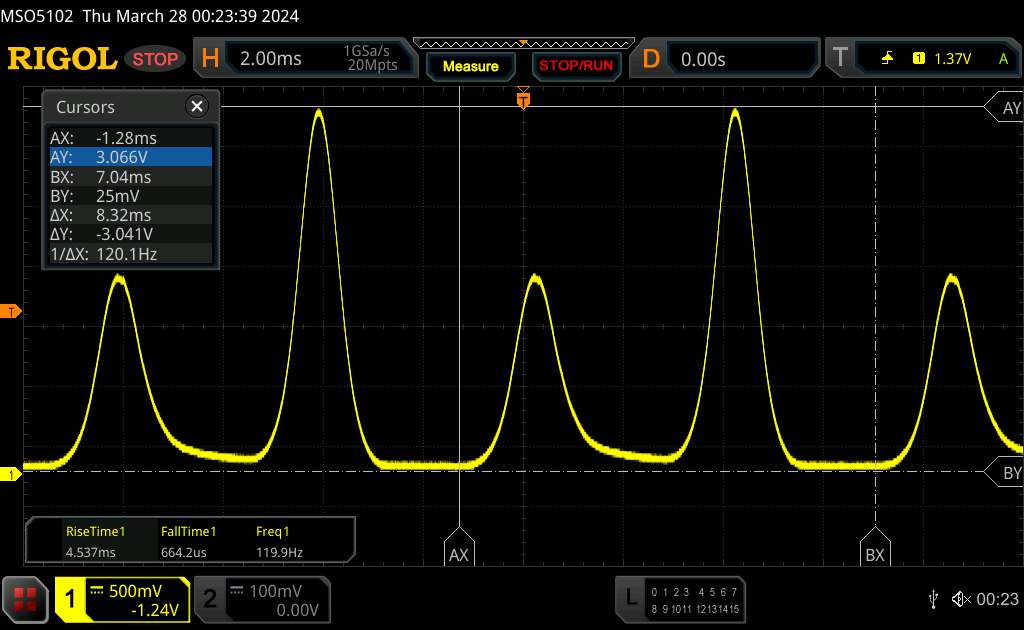 Seria pomiarów przy stałym poziomie powiększenia z różnymi ustawieniami jasności (Nawet jeśli amplituda przy minimalnej jasności wygląda płasko, jest to spowodowane skalowaniem. Mogą Państwo zobaczyć powiększoną wersję aamplitudy przy minimalnej jasności w polu informacyjnym)