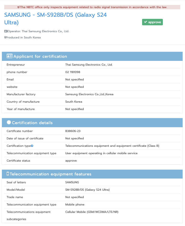 Tajlandzka Krajowa Komisja Radiofonii i Telekomunikacji (NBTC) opublikowała wstępną dokumentację dla SM-S928B/DS, globalnej wersji Galaxy S24 Ultra. Dla kontekstu, przyrostek "DS" oznacza, że urządzenie to posiada również łączność dual-SIM. Co zaskakujące, NBTC wymieniło Galaxy S24 Ultra z nazwy, w przeciwieństwie do swoich odpowiedników w innych krajach, takich jak Federalna Komisja Łączności (FCC).