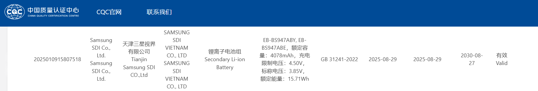 Samsung rzekomo zarejestrował komponent, który może być zgodny z tą specyfikacją w chińskim regulatorze 3C. Bateria EB-BS947ABY ma pojemność znamionowa wynosi 4078 mAh, co można zaokrąglić w górę do 4200 mAh dla typowej wartości.