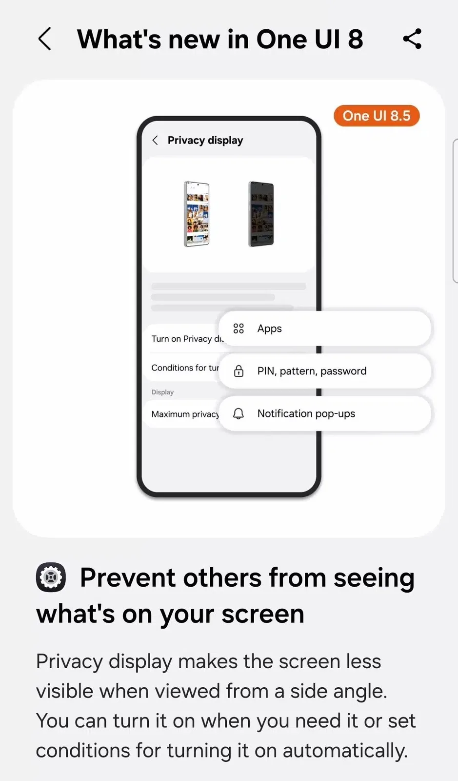Tak zwany wyświetlacz prywatności ma symulować osłonę ekranu, która znacznie ogranicza kąty widzenia, aby utrudnić pobliskim obserwatorom zobaczenie prywatnych danych. Wstępne zrzuty ekranu okna dialogowego ustawień nowej funkcji wyświetlacza wyciekły już w październiku 2025 roku, a aplikacja Tips ujawniła teraz również oficjalny opis tej funkcji: