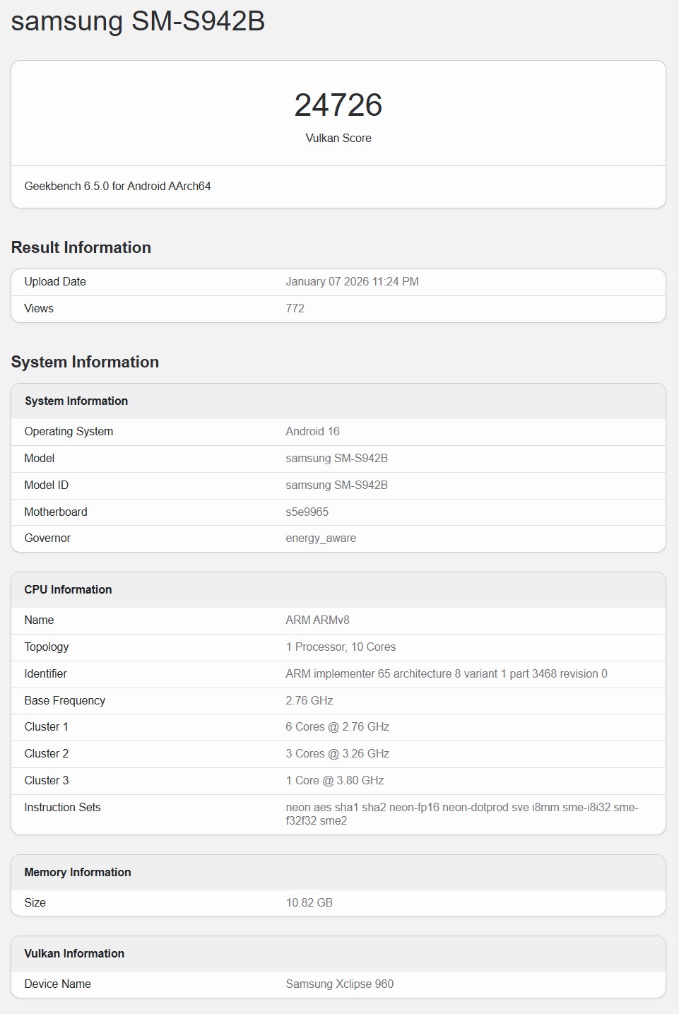 Urządzenia testowe Samsung Exynos 2600 pojawiały się już w Geekbench w przeszłości i dawały wskazówkę co do oczekiwanej wydajności procesora. Teraz w bazie danych Geekbench pojawił się również smartfon Samsunga o numerze modelu SM-S942B. Oczekuje się, że model ten będzie międzynarodowym Galaxy S26. Jak widać ze specyfikacji, posiada on 10-rdzeniowy SoC z Samsung Xclipse 960, co oznacza, że jest to wyraźnie Exynos 2600. Jest to również dość oczywista wskazówka, że europejski Galaxy S26 będzie wyposażony w wewnętrzny procesor Samsunga.
