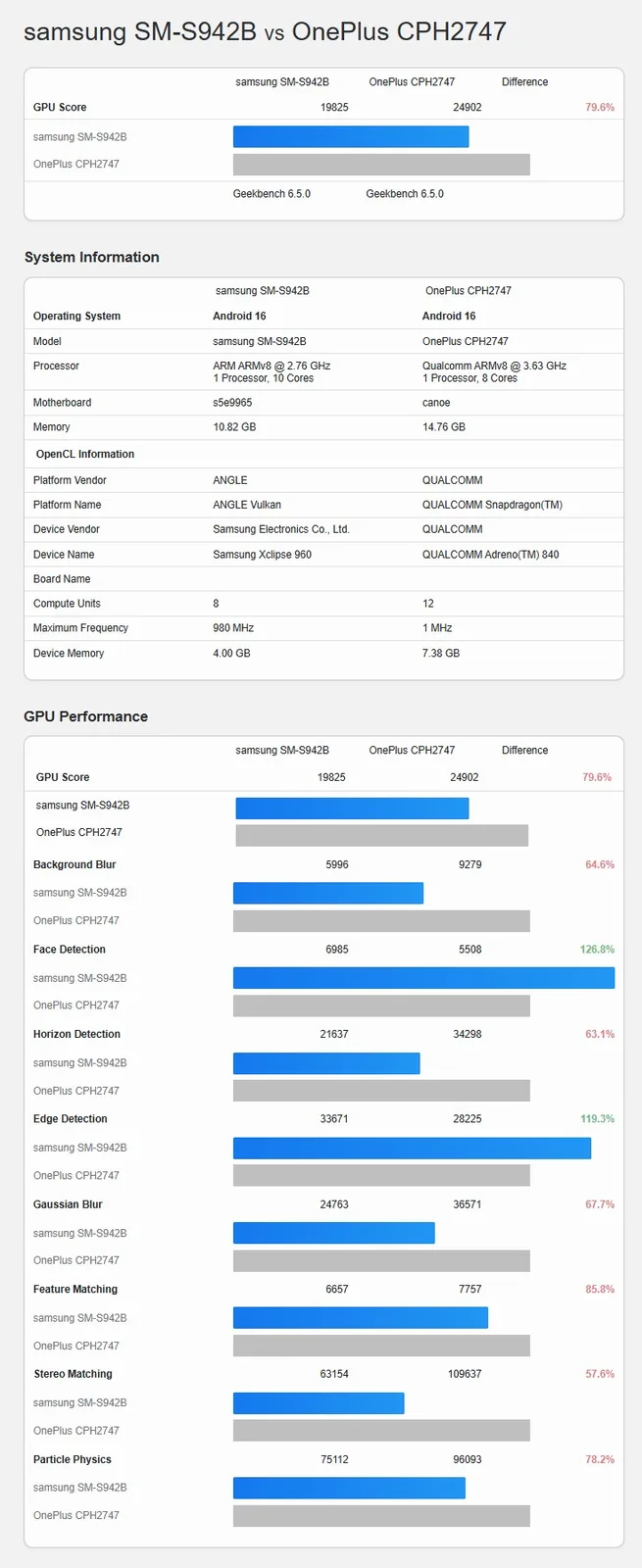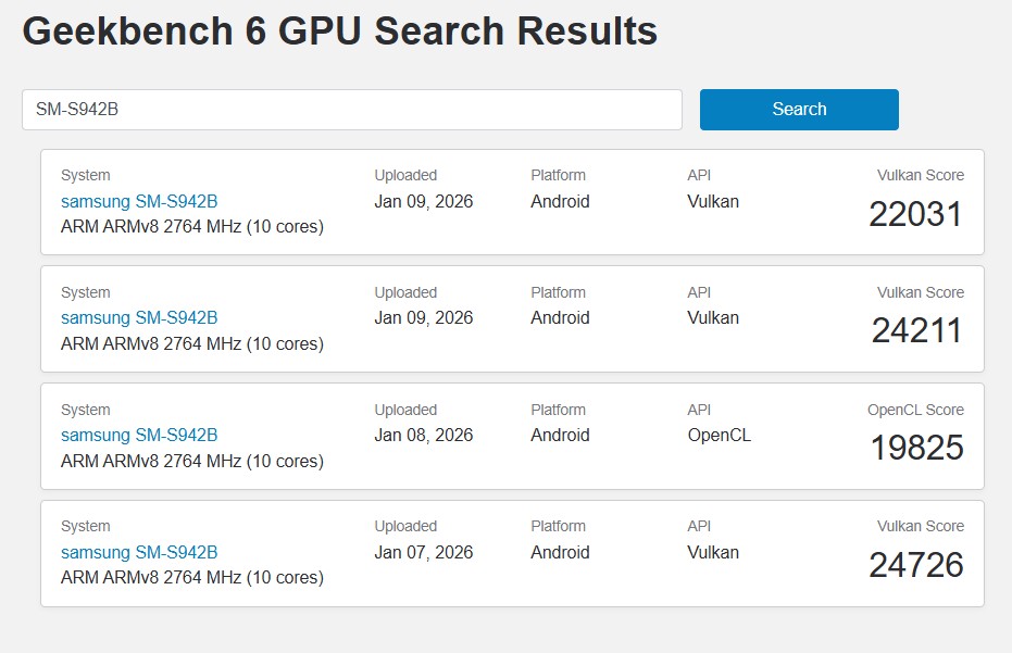 W tym przypadku nie jest to benchmark CPU, ale test GPU Vulkan i OpenCL. We wczesnych testach ta jednostka graficzna zbliżyła się dość blisko do Snapdragona 8 Elite Gen 5, który znajduje się w OnePlus 15(od 999 USD na Amazon) i innych telefonach Android. Porównanie nie jest do końca uczciwe, ponieważ Samsung Galaxy S26 prawdopodobnie uzyska większą wydajność w nadchodzących tygodniach dzięki optymalizacji oprogramowania. Mimo to, GPU Xclipse 960 oferuje już 88% wydajności GPU Adreno 840 w Vulkan lub nieco poniżej 80% w OpenCL.