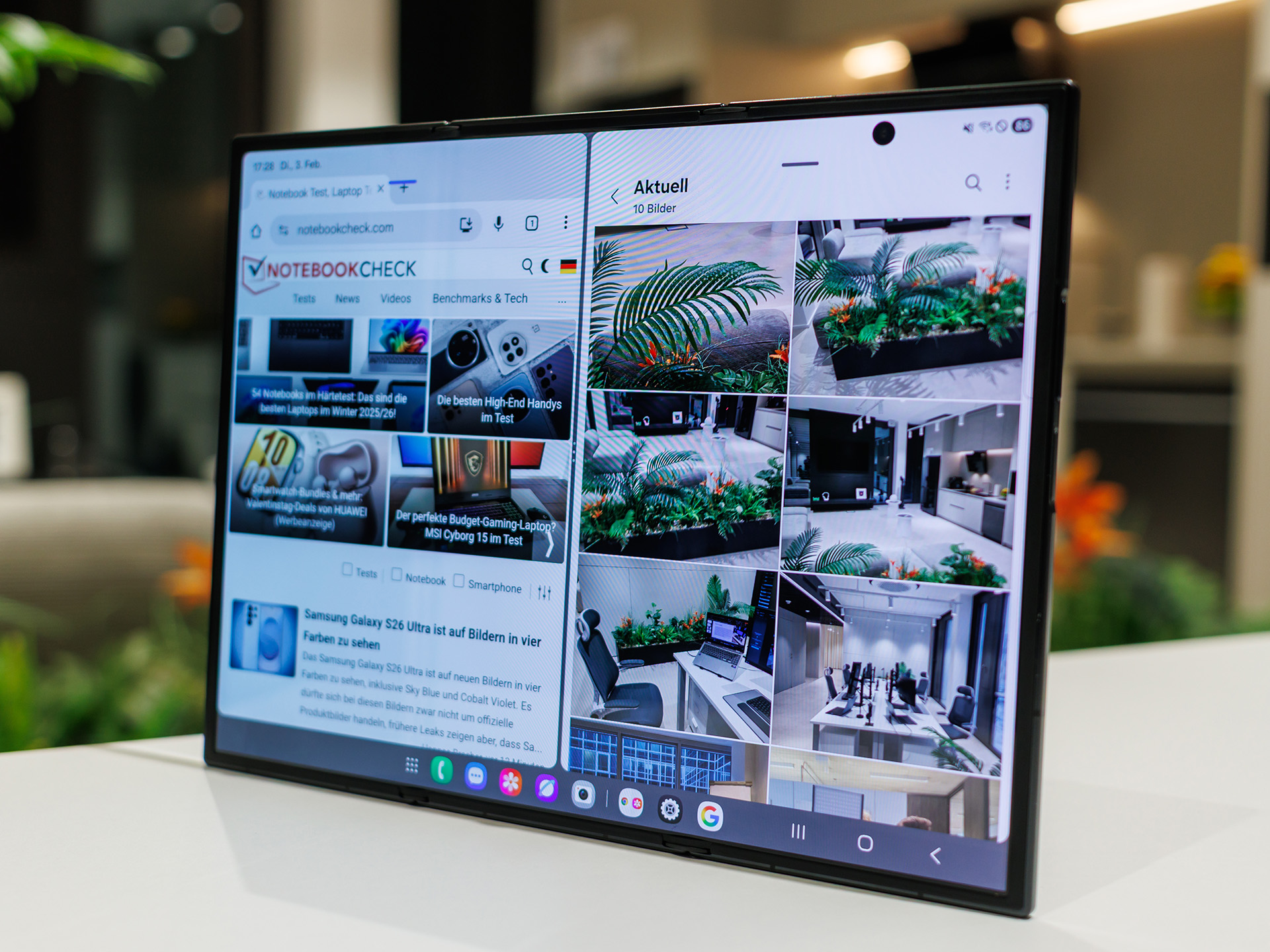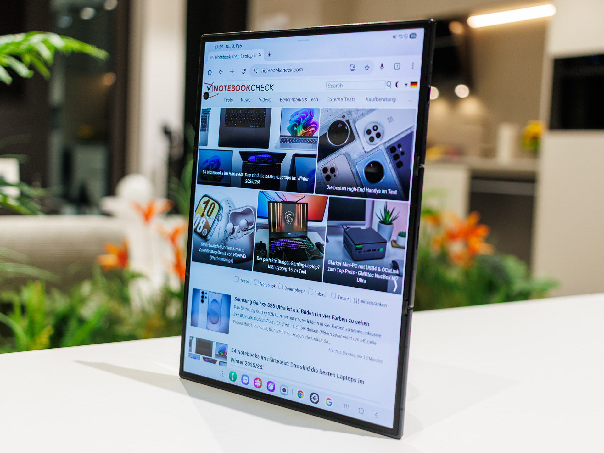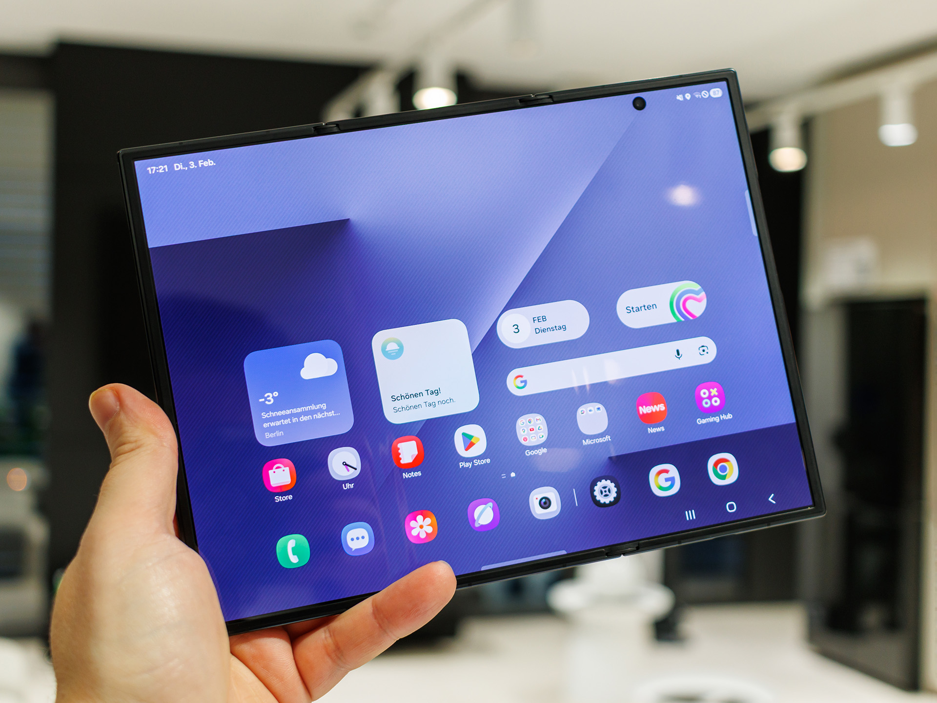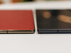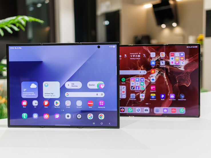 Huawei był pionierem eleganckiego mechanizmu składania w kształcie litery Z w Mate XT (tutaj w praktyce), który może płynnie przełączać się między 6,4-calową osłoną, 7,9-calowym podwójnym i 10,2-calowym pełnym ekranem. Przy minimum 3,6 mm po rozłożeniu jest ultracienki (najgrubszy element: 4,25 mm) i waży 298 gramów. Samsung (wysokość: 3,9 / 4,2 / 4,0 mm), z drugiej strony, opiera się na konstrukcji w kształcie litery U z oddzielnym 6,5-calowym wyświetlaczem i dwoma bocznymi skrzydłami, które otwierają się na 10-calowy panel Dynamic AMOLED 2X; Rezultat jest bardziej wytrzymały (IP48), ale większy (12,9 mm po złożeniu, 309 g) i wizualnie bardziej stonowany z grubszymi krawędziami. Tył o wyglądzie karbonu jest również bardzo podatny na odciski palców. W zamian za to zawias TriFolda jest ciaśniejszy, przez co sprawia bardziej stabilne wrażenie. Szkoda jednak, że Samsung nie pozwala na korzystanie tylko z dwóch elementów ekranu. Różnice w wysokości i wadze są praktycznie niezauważalne w codziennym użytkowaniu.