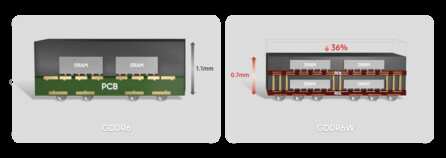 Pojemność jest teraz podwojona z 16 Gb do 32 Gb na matrycę, podczas gdy liczba pinów I/O podwoiła się z 32 do 64. Przekłada się to nie tylko na 50% redukcję powierzchni w stosunku do GDDR6X, ale FOWLP zmniejsza również wysokość matrycy z 1,1 mm do 0,7 mm poprzez wyeliminowanie warstwy bazowej PCB i zastąpienie jej waflem krzemowym, w którym zintegrowane są same chipy VRAM.