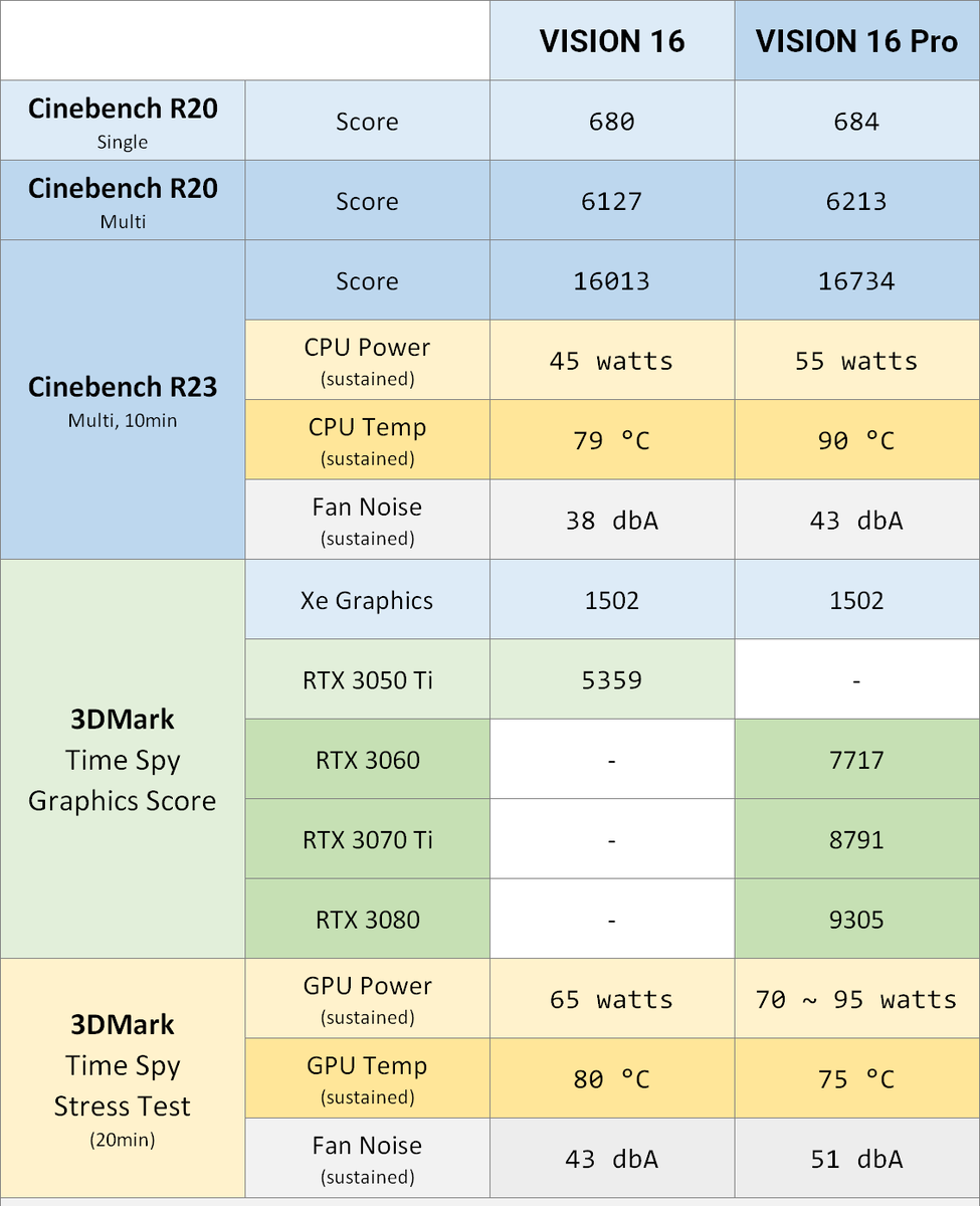 Jeśli chodzi o opcje GPU, to model Vision 16 można skonfigurować bez dGPu lub z RTX 3050 Ti który pracuje z mocą do 65 W (50 W TGP plus 15 W Dynamic Boost 2.0). Z drugiej strony, wariant Pro oferuje więcej opcji GPU, jak np RTX 3060, 3070 Ti oraz 3080 z 16 GB pamięci GDDR6. Ze względu na smukłą obudowę, opcje te są zoptymalizowane pod kątem wydajności, a ich moc obliczeniowa wynosi do 95 W każda (70 W TGP plus 25 W Dynamic Boost 2.0)