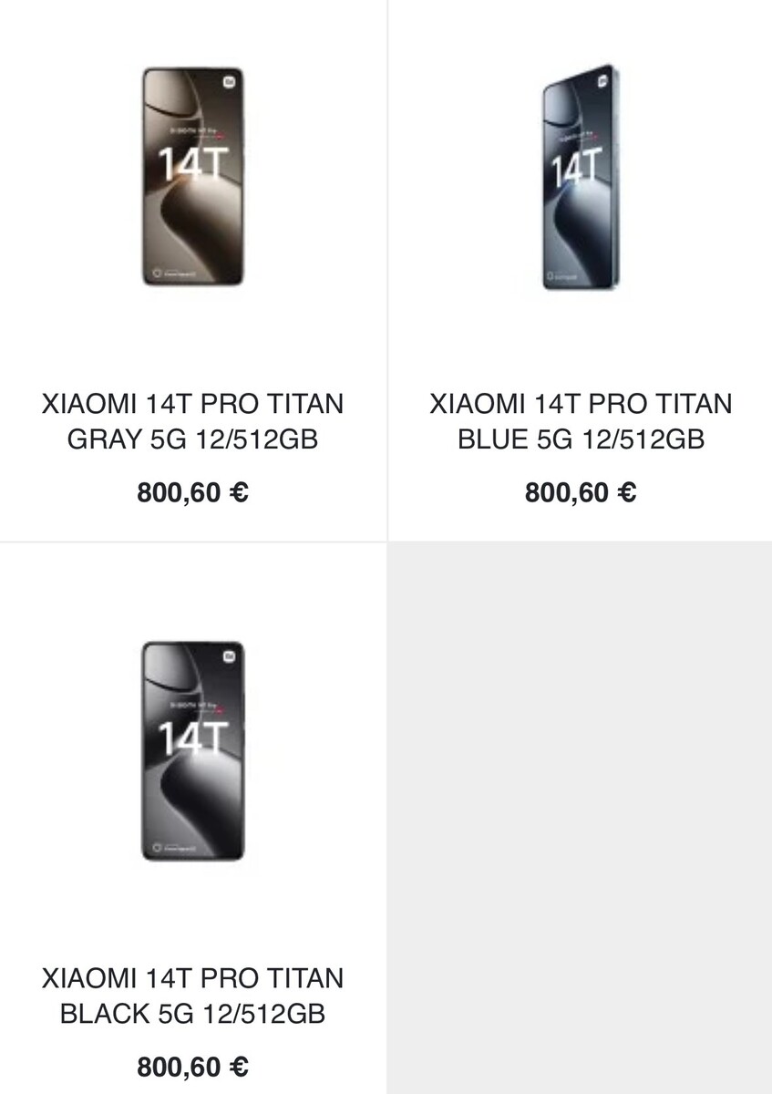 Bardziej premium Xiaomi 14T Pro jest wymieniony z ceną 800 € za 12/512 GB SKU i jest dostępny w kolorach Titan Grey, Titan Black i Titan Blue - podobnie jak Xiaomi 14T.