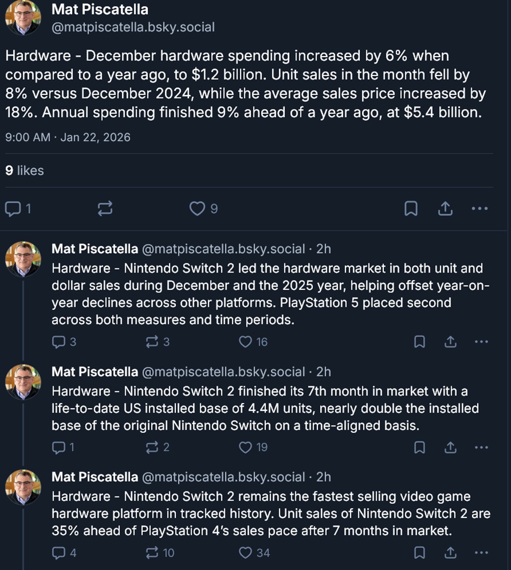 Pomimo trudnych warunków ekonomicznych, nabywcy konsol w Stanach Zjednoczonych odczuli wzrost w grudniu. Przychody ze sprzętu wzrosły o 6% w tym miesiącu w porównaniu do 2024 roku, nawet przy mniejszej liczbie sprzedanych egzemplarzy. Ponieważ niektóre systemy stały się mniej przystępne, średnia cena sprzedaży wzrosła o 18%. Gracze zaakceptowali również znacznie wyższą cenę Switch 2 niż poprzedniego handhelda.
