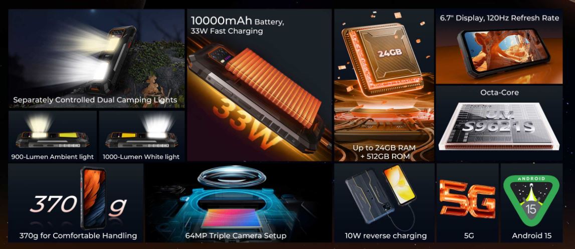 Tak czy inaczej, smartfon Oukitel jest wyposażony w baterię o pojemności 10 000 mAh, którą można ładować z mocą do 33 watów. Obsługuje również ładowanie wsteczne 10 W, dzięki czemu może być używany jak power bank. Co więcej, WP58 Pro jest zasilany przez SoC z ośmioma rdzeniami i obsługą 5G, więc nie jest ograniczony do 4G LTE, jak niektóre inne tanie wytrzymałe smartfony. Pozostałe specyfikacje obejmują 8 GB pamięci RAM, podczas gdy 512 GB pamięci masowej jest również rozsądnej wielkości. Telefon działa na Android 15 po wyjęciu z pudełka, a użytkownicy mogą rozszerzyć pamięć masową za pomocą microSD, poświęcając jedno z dwóch gniazd kart SIM.