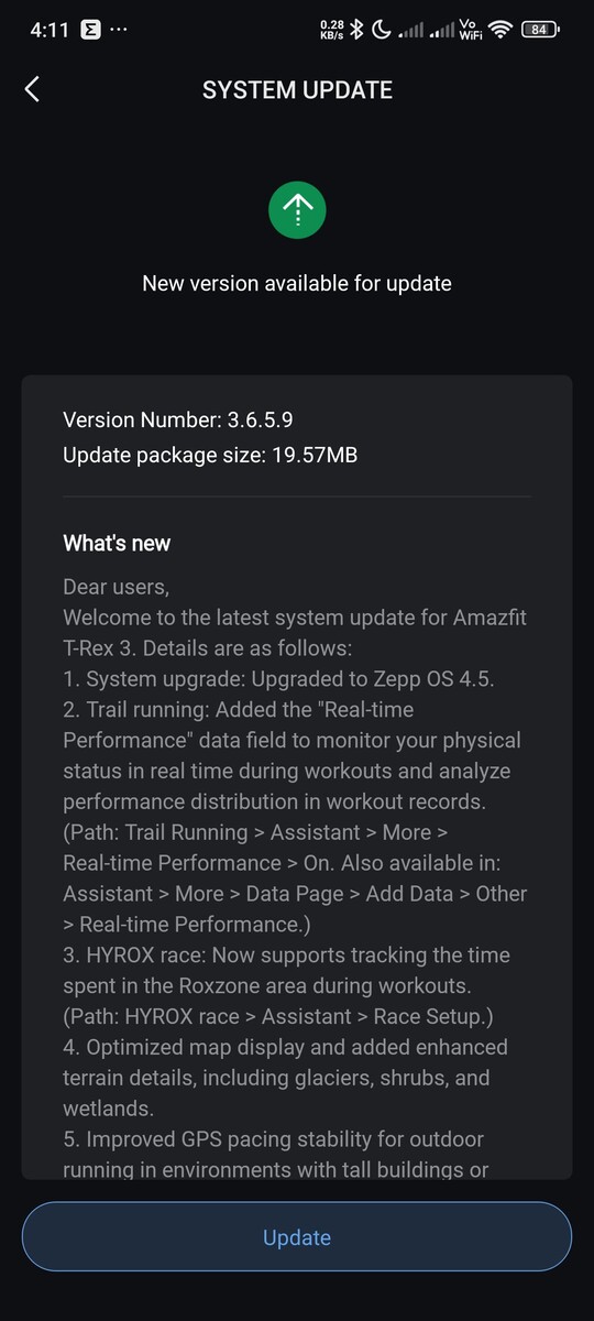 Wersja 3.6.5.9 aktualizuje T-Rex 3 do Zepp OS 4.5 z Zepp OS 4.0. W informacjach o wydaniu podano, że aktualizacja wprowadza nowy wskaźnik wydajności w czasie rzeczywistym dla aktywności Trail Running. Umożliwia to śledzenie "stanu fizycznego" w czasie rzeczywistym, z dalszą analizą dostępną również w zapisie treningu. Narzędzie to można włączyć, przechodząc do Trail Running > Assistant > More > Real-time Performance.