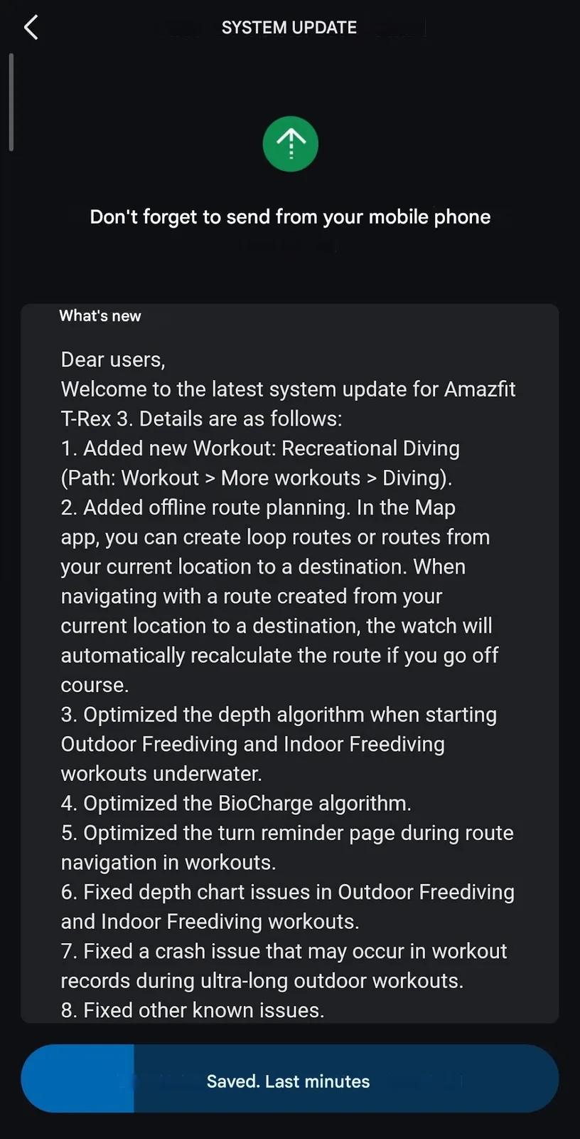 Z wersją oprogramowania 4.5.3.3, zgłoszone na 4PDAużytkownicy Amazfit T-Rex 3 otrzymują narzędzie do planowania tras offline. Dostępne za pośrednictwem aplikacji Mapy smartwatcha, można wybrać utworzenie trasy z lokalizacji do wybranego miejsca docelowego lub w pętli, z funkcją automatycznej zmiany trasy. Ponadto zegarki te obsługują teraz również nurkowanie rekreacyjne, aktywność, którą można znaleźć, przechodząc do Trening > Więcej treningów > Nurkowanie.