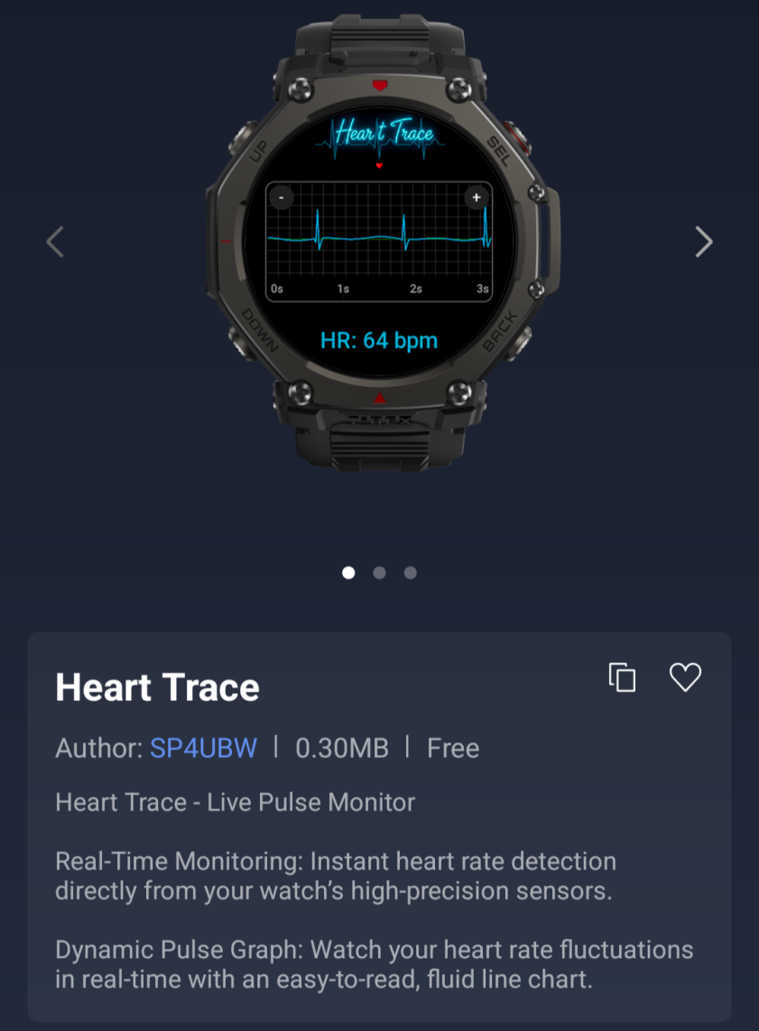 Najpopularniejszą z trzech aplikacji Mini Apps jest Heart Trace, zajmująca obecnie drugie miejsce w rankingu Zepp OS Weekly Top 50 Downloaded Apps Chart. Jest to monitor pulsu na żywo, umożliwiający użytkownikom przeglądanie danych tętna zebranych przez ich smartwatch w czasie rzeczywistym. Pomiary są wyświetlane na dynamicznym wykresie pulsu, który jest opisywany przez dewelopera jako "łatwy do odczytania, płynny wykres liniowy".