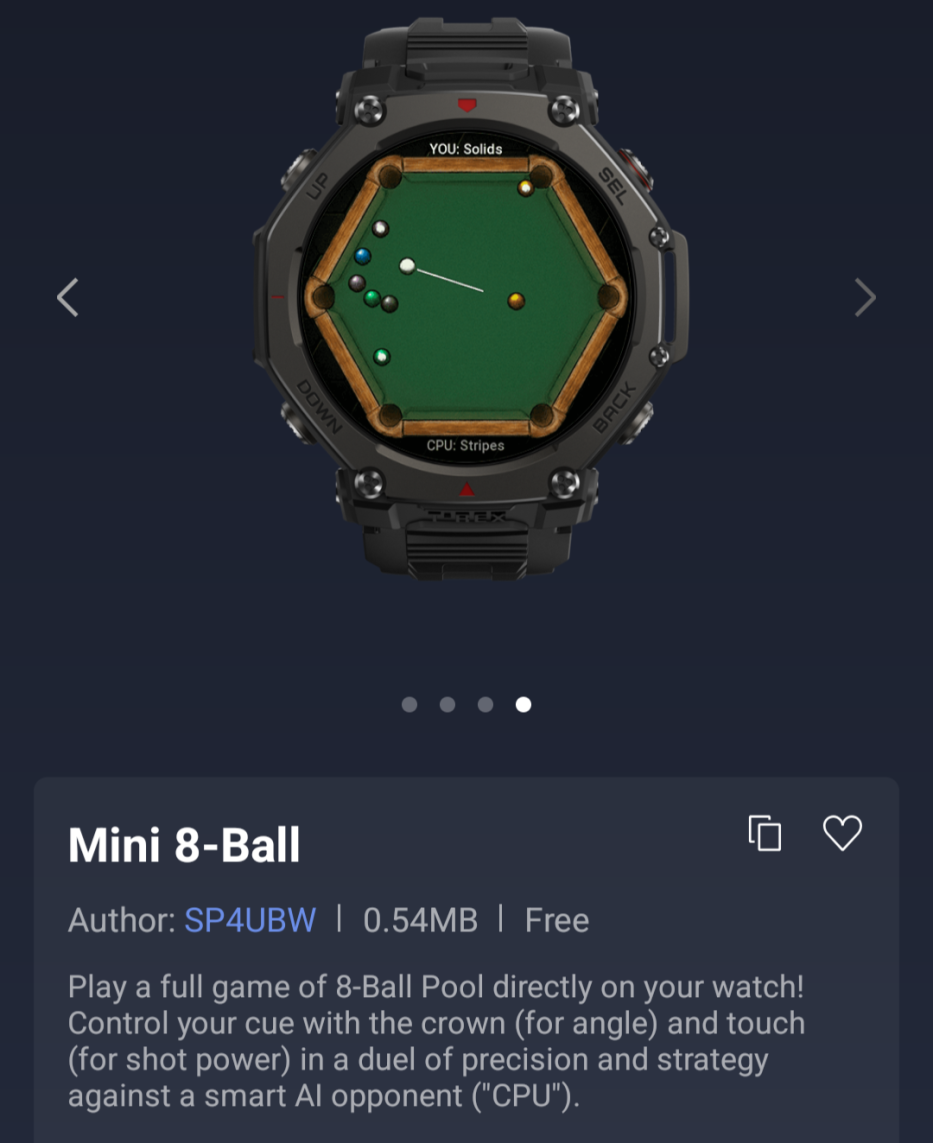 Istnieją również dwie nowe gry dla użytkowników urządzeń do noszenia Amazfit. Pierwszą z nich jest Mini 8-Ball, w której można zagrać w bilard 8-Ball przeciwko graczowi wygenerowanemu przez sztuczną inteligencję na zegarku. Kąt nachylenia kija bilardowego można regulować za pomocą korony smartwatcha, a moc jest kontrolowana za pomocą dotyku. Druga to Quick Math, aplikacja do treningu mózgu, w której użytkownicy otrzymują wynik za rozwiązywanie równań w określonym czasie.
