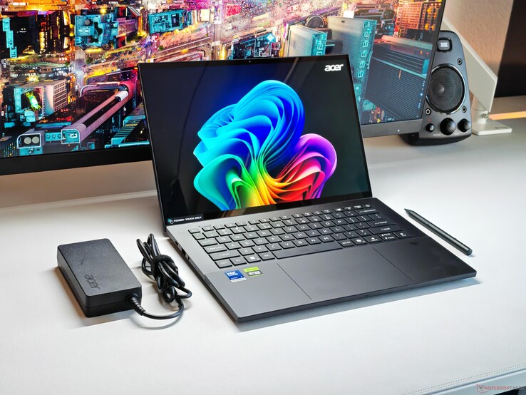 Akumulator o pojemności 76 Wh zapewnia rozsądne czasy pracy, ale procesor Lunar Lake nie zapewnia tutaj przewagi. Z 9 godzinami w teście WLAN przy 150 cd/m² i 6:45 godzinami przy pełnej jasności, Acer wyprzedza tylko Razer Blade 14 (72 Wh), ale także wyraźnie za ROG Zephyrus G14 (73 Wh).