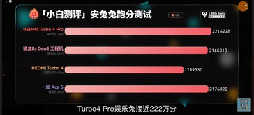 Zgodnie z oceną przeprowadzoną przez Xiaobai's Tech Reviews, Redmi Turbo 4 Pro odnotowuje wynik jednordzeniowy na poziomie 2165 w Geekbench 6 i wynik wielordzeniowy na poziomie 7005. W AnTuTu telefon osiąga łączny wynik 2 216 228 punktów. Po stronie GPU, Redmi Turbo 4 Pro uzyskuje wynik 4,619 w teście 3DMark WildLife Extreme.