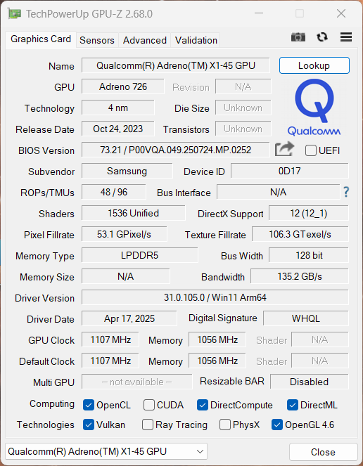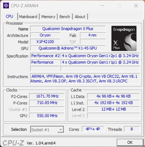 Procesor Qualcomm Snapdragon X1P-42-100 oferuje 8 rdzeni o maksymalnym taktowaniu 3,4 GHz. X1P-42-100 nie obsługuje jednak funkcji CPU boost, którą oferują droższe modele. Zużycie energii przez procesory Snapdragon wciąż nie może być odczytane. Jednak w oparciu o nasze pomiary zużycia energii, procesor powinien zużywać około 35 watów (później 30 watów). Połączone obciążenie CPU/GPU prowadzi do ~40-45 watów zużycia energii.