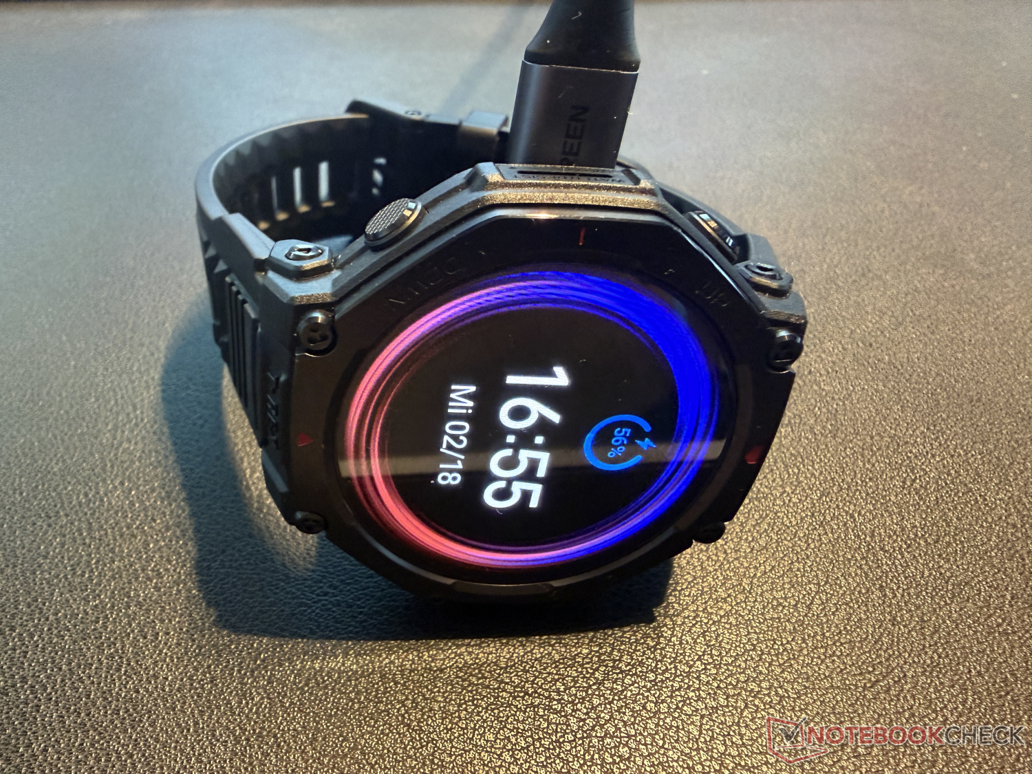 Przy zwiększonej aktywności na świeżym powietrzu żywotność baterii jest odpowiednio zmniejszona, ale powinna wynosić co najmniej tydzień przy normalnym użytkowaniu. Amazfit T-Rex 3 Pro jest zatem dość trwały i tylko sporadycznie wymaga przerwy na ładowanie. Do tego celu służy dostarczony adapter do ładowania, który mocuje się magnetycznie z tyłu smartwatcha. Po pół godzinie osiągnięto już nieco poniżej 50 procent. Pełny proces ładowania od 0 do 100 procent jest zakończony w mniej niż 90 minut.