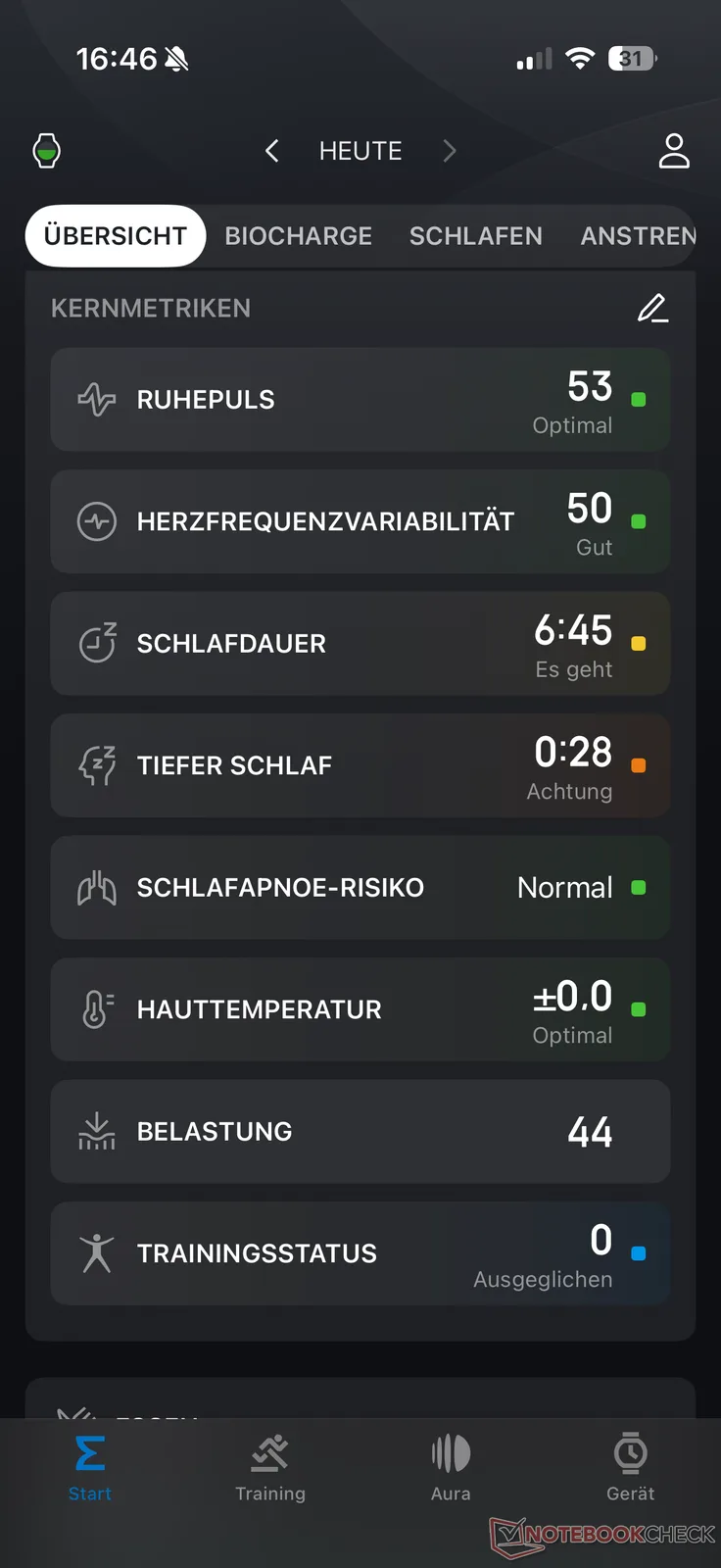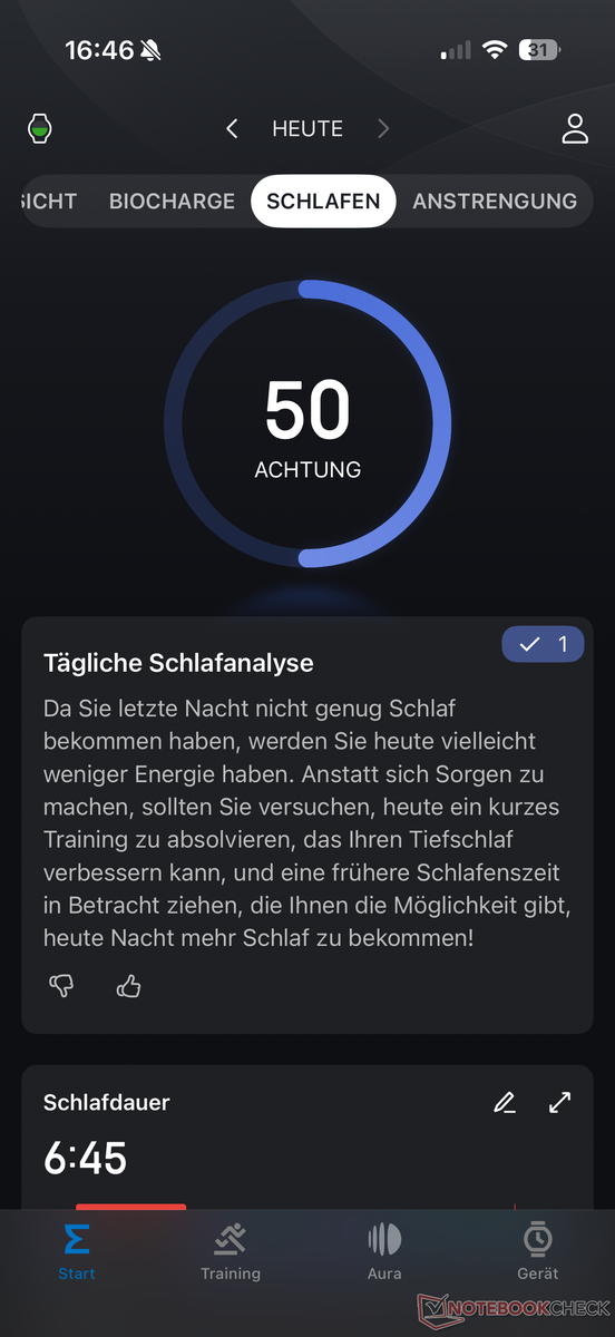 Krótki przegląd poprzedniej nocy można wyświetlić bezpośrednio na zegarku. Podobnie jak w przypadku wielu innych funkcji, szczegółowa analiza jest dostępna w aplikacji Zepp. Podczas gdy tygodniowe i miesięczne trendy są dostępne bezpłatnie, niektóre funkcje AI, takie jak pomoc w zasypianiu z dźwiękami dostosowanymi do bicia serca, mogą być używane tylko z płatną subskrypcją Aura.
